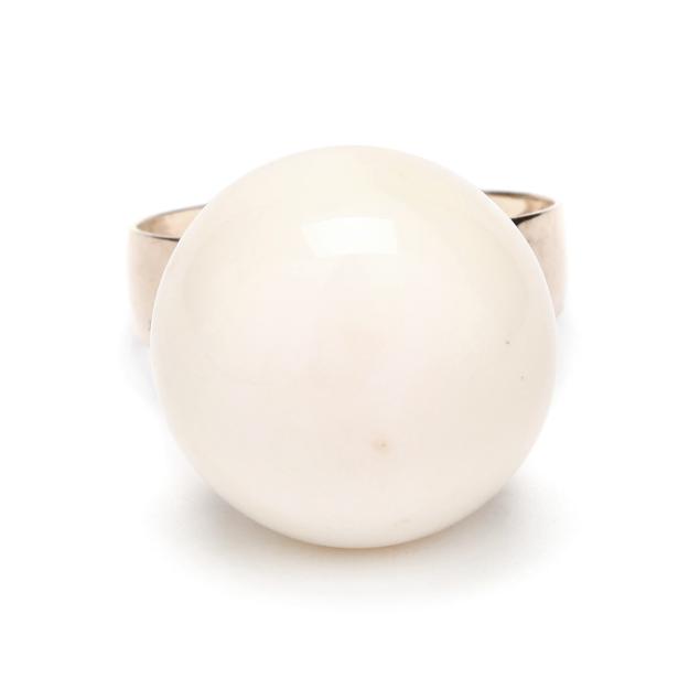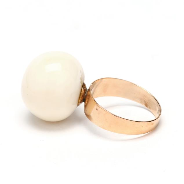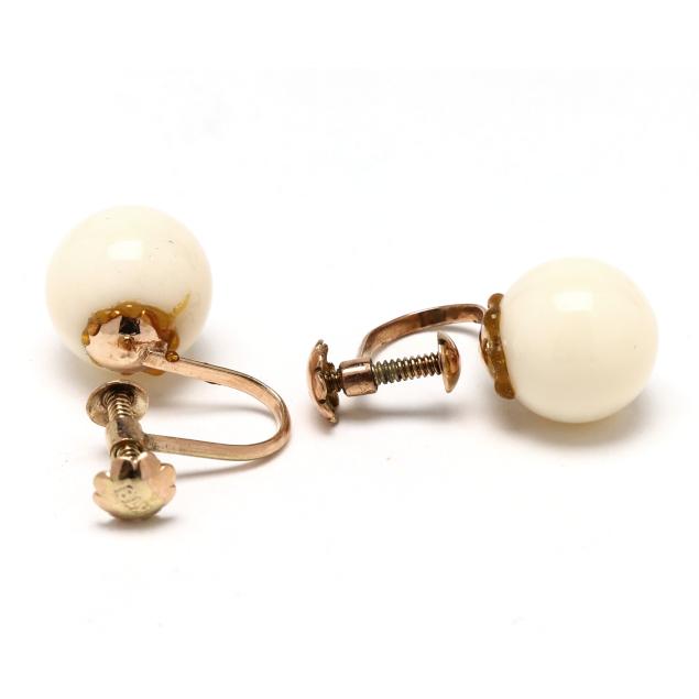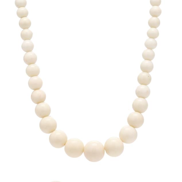 To include: a graduated coral bead necklace strung with (73) graduated white coral beads (5.4mm to 12.2mm) completed with a screw clasp (18.5 in.); a pair of white coral bead 10.5mm) earrings completed with screw backs stamped K18 (remnants of adhesive), XRF testing 12KT; and a white coral bead (16mm) ring post set to a shank stamped K18 (ring size 6.25), XRF testing 12KT.