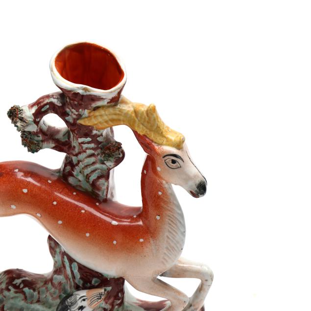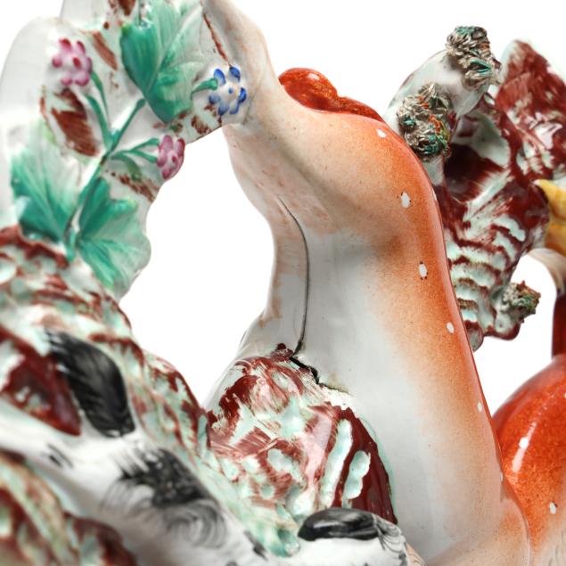 Several breaks and repairs with associated restoration, namely to front and rear legs of fawn; firing crack along snout of fawn.