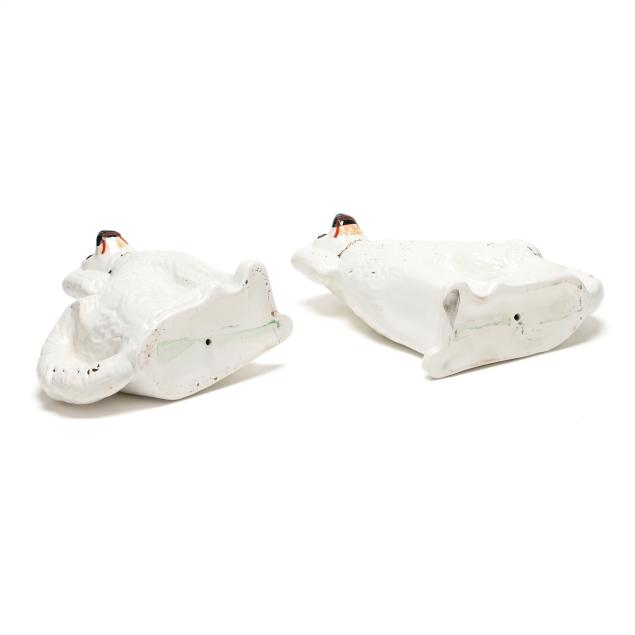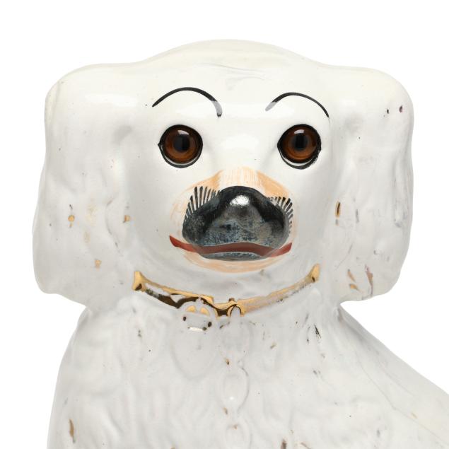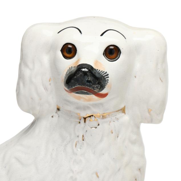 England, second half 19th century, hand-painted and gilt pearlware Spaniels with collars and chains, both with inset glass eyes, unmarked.