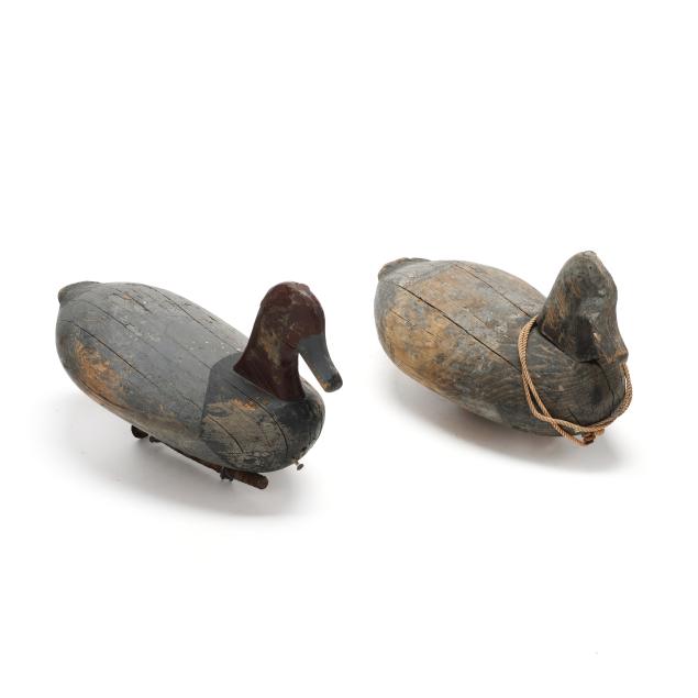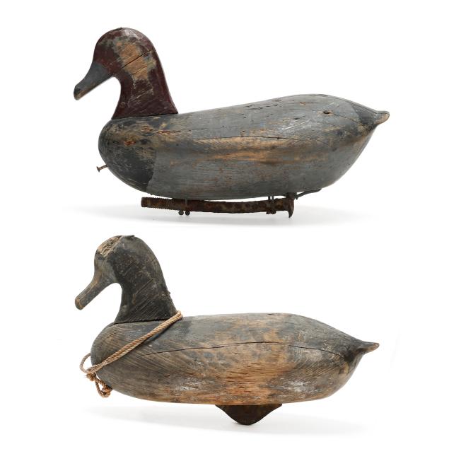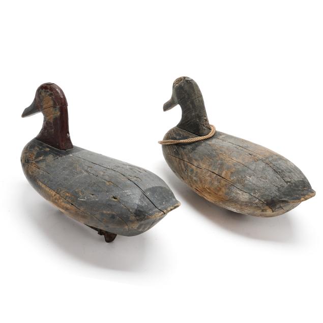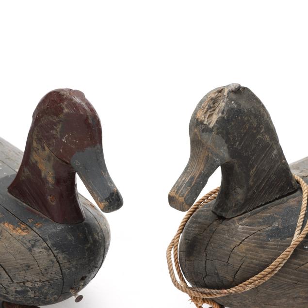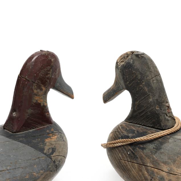 Original paint worn to bare wood in places, multiple age checks in the body, chip to the head of the hen, neck crack in the drake with light movement.