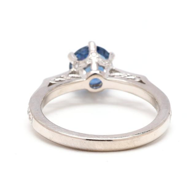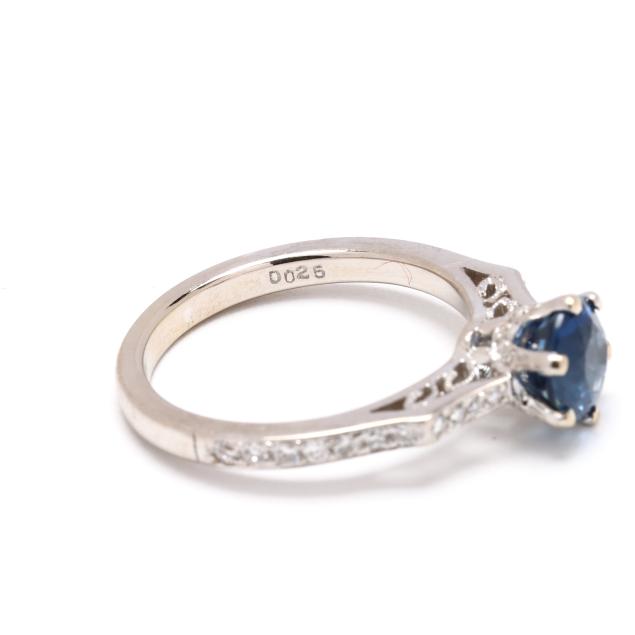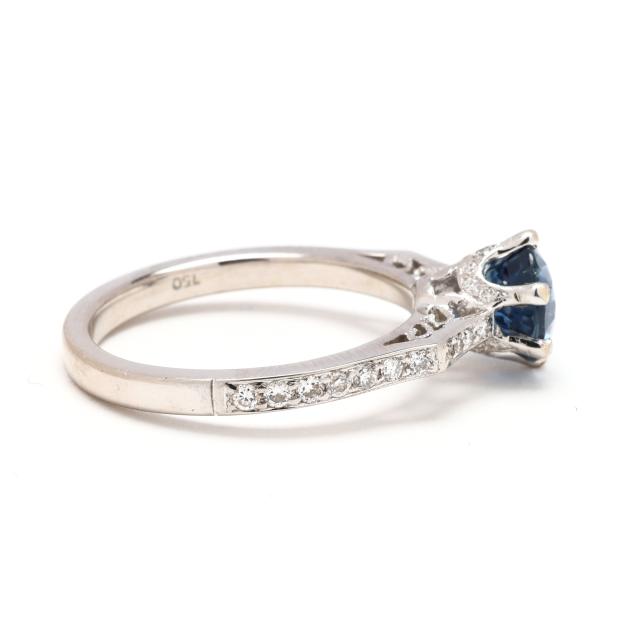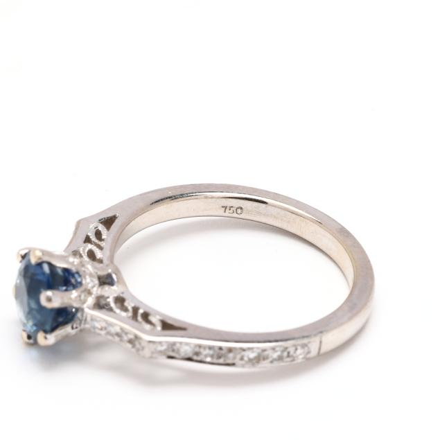 Centered on a round cut sapphire (6.5 - 6.6 x 4.2mm) weighing approximately 1.32 carats, set to the shoulders and the gallery with full cut round diamond melee, weighing approximately .25 total carat, stamped 750 / D025.
