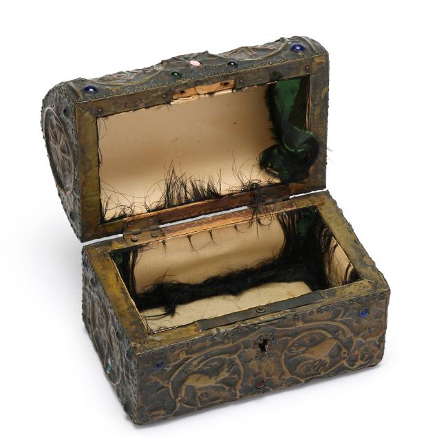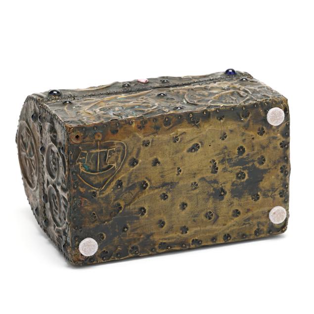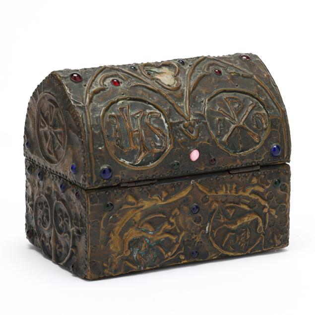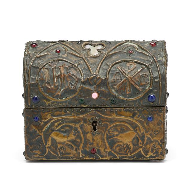 France, circa 1900, wooden domed box with patinated repoussé bronze overlay, inset with colored glass and mother of pearl, underside with the mark of Armand Frenais, each side of domed lid features "IHS" alongside Chi-Ro-Omega and trinity symbols, the base features bird and foliate motifs, all interspersed with hammered diapering, interior with remnants of green silk.