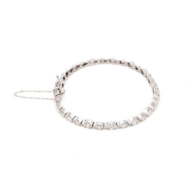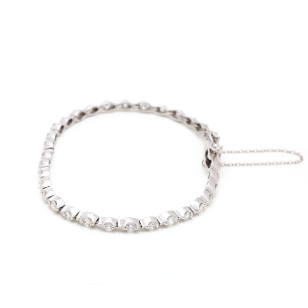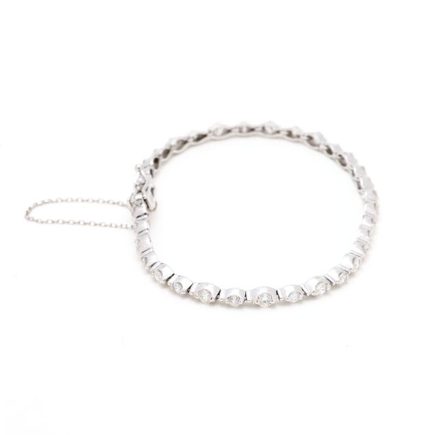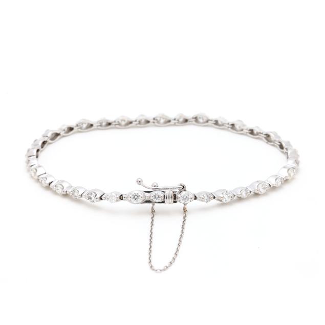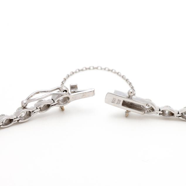 Each oval shaped link set with a full cut round diamond (2.25 - 2.5mm) weighing approximately 1.7 total carats (H-I color, I1-I2 clarity), completed with an integrated box clasp, figure eight safety, and safety chain, stamped K18 / WG.