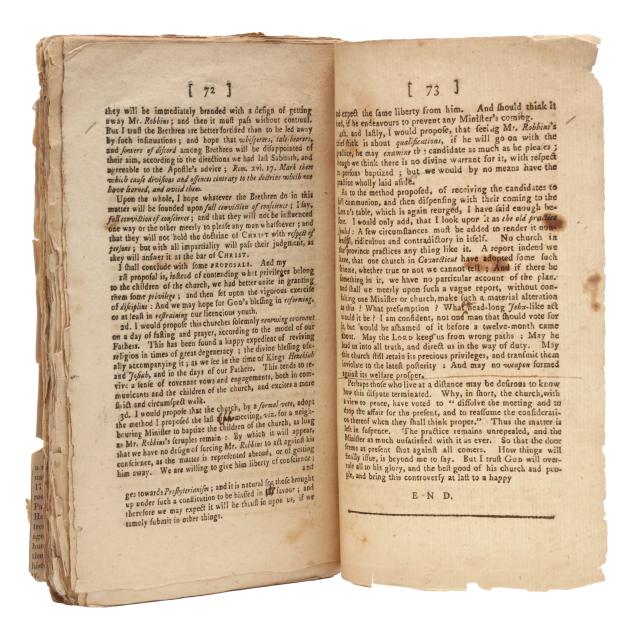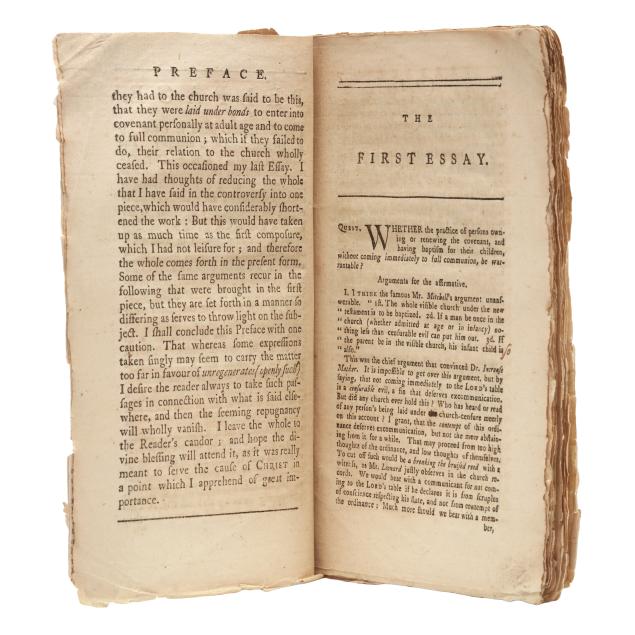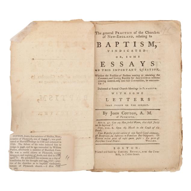 John Cotton. THE GENERAL PRACTICE OF THE CHURCHES OF NEW-ENGLAND, RELATING TO BAPTISM, VINDICATED: OR, SOME ESSAYS ON THIS IMPORTANT QUESTION, WHETHER THE PRACTICE OF PERSONS OWNING OR RENEWING THE COVENANT, AND HAVING BAPTISM FOR THEIR CHILDREN WITHOUT COMING IMMEDIATELY INTO FULL COMMUNION, BE WARRANTABLE? DELIVERED AT SEVERAL CHURCH-MEETINGS IN PLYMOUTH. WITH SOME LETTERS THAT PASSED ON THE SUBJECT. Boston: Printed and Sold by Ezekiel Russell, next the Cornfield, in Union-Street, [1772]. First edition. Stab-sewn pamphlet. 4to; [A4] B4-K4 (K4v blank); [6], [1]-73, [1]pp. ESTC W12384; Sabin 17100; Evans 12367.