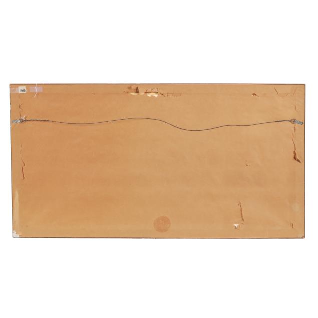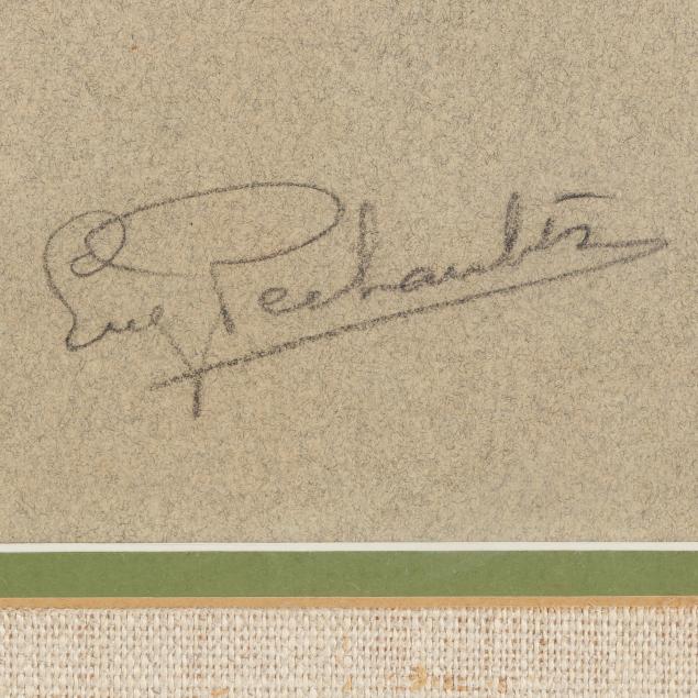 Mixed media with watercolor and whitening on colored paper, signed at lower right, matted and framed under glass.