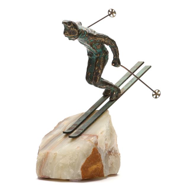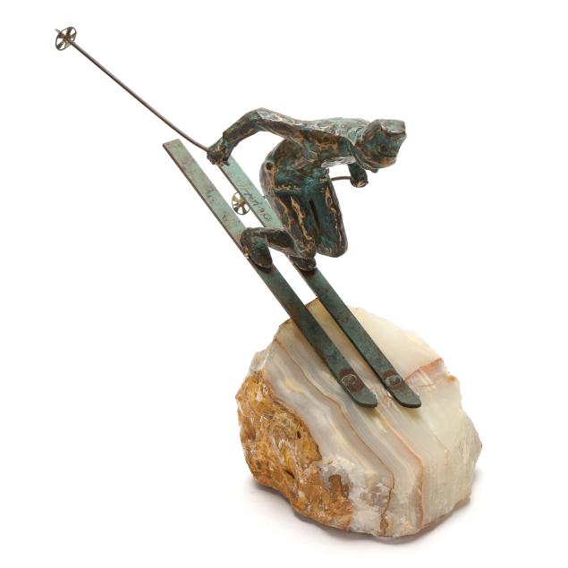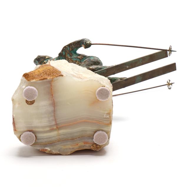 Late 20th century, patinated bronze and metal downhill skier mounted to cut onyx base, signed to back of one ski.