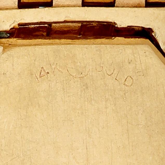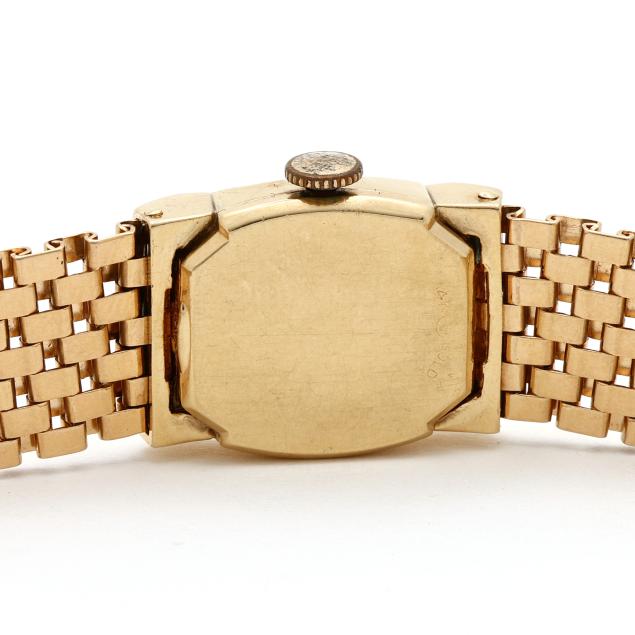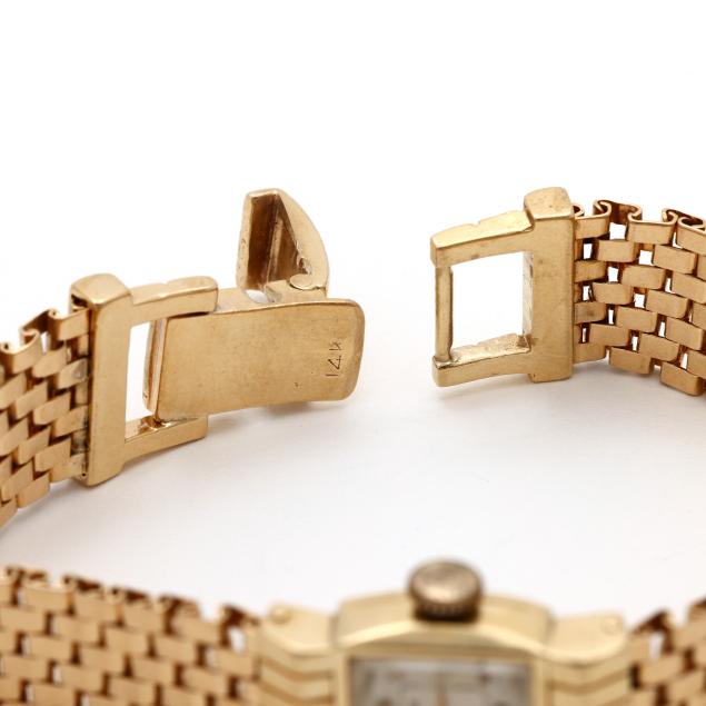 Manual wind, Waltham 675, reference number 140758, serial number 47390, the gold rectangular case with polished bezel, the signed white dial with Arabic numeral hour markers and gold alpha hands, the gold mesh bracelet with fold over clasp stamped 14K, the signed caseback interior numbered 140758 / 4 and stamped 14K Gold.