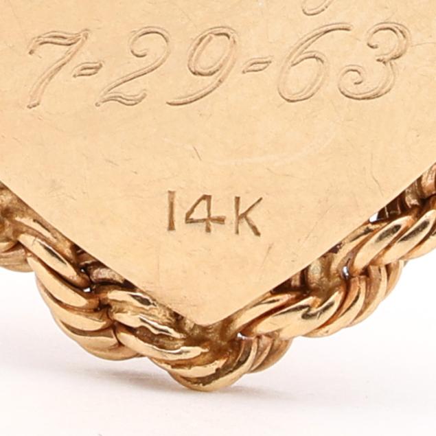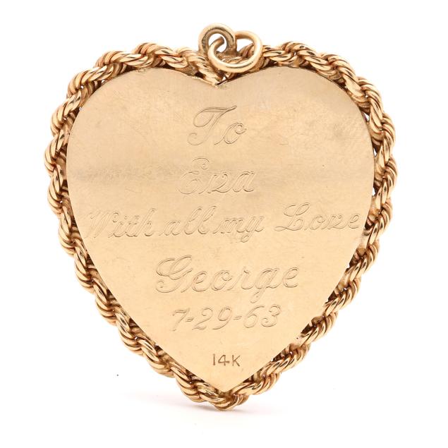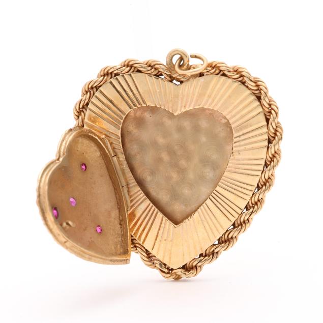 The central textured gold heart locket with star set synthetic ruby accents, opens to a heart-shaped picture frame, set atop a larger heart shape with radiating lines and rope twist border, the reverse with presentation engraving dated 7-29-63, completed with a jump ring, stamped 14K.