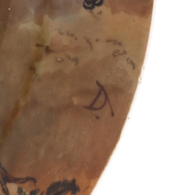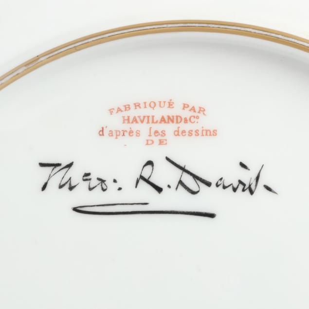 Produced in France, 1880s, hand-painted and gilt porcelain plate, decorated with scene of The Cranes' Walk 'Round, depicting a group of sand-hill cranes at sunset with the patriarch at center, signed "D" after original designs by Theodore R. Davis (American, 1840-1894), the underside marked with blue design patent mark "August 10, 1880 / No. 11936", presidential eagle to underside of border, and green Haviland monogram and red printed factory mark.