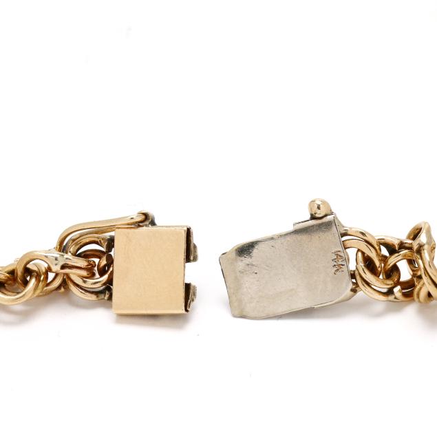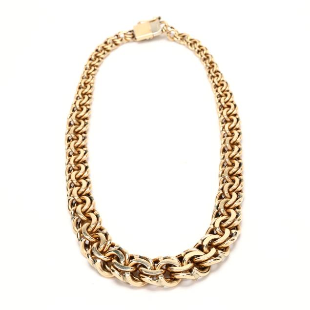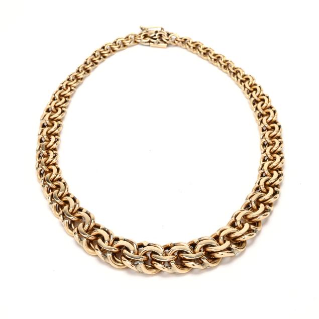 The tapered double curb link necklace, completed with an integrated box clasp with figure eight safety, stamped 14K.
