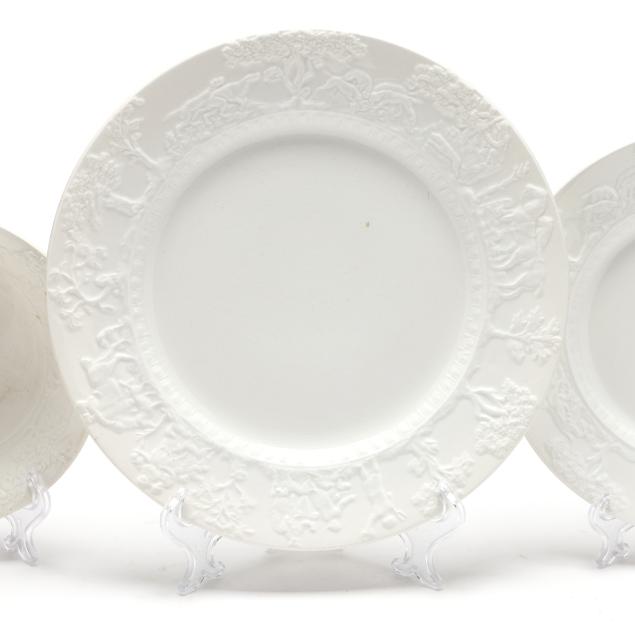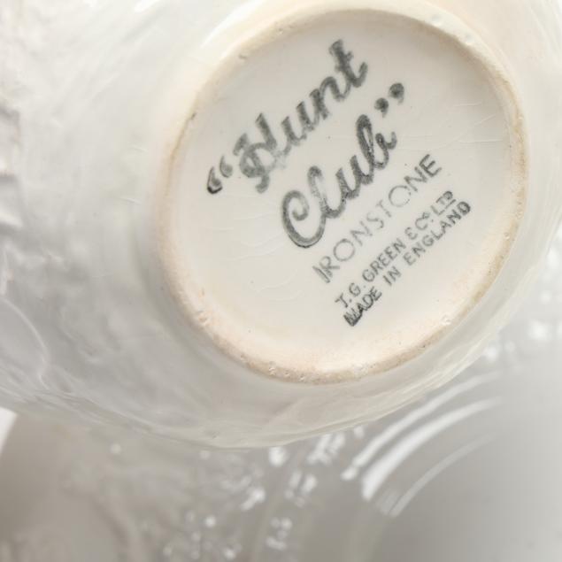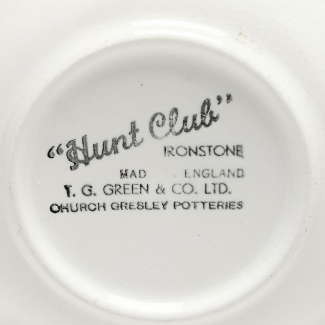 England, (49) pieces in discontinued pattern, ironstone china with bas-relief hunting scenes to rim, including (10) dinner plates (10 1/8 in.); (11) salad plates (8 1/4 in.); (1) bread and butter plate (6 1/4 in.); (7) coupe cereal bowls (6 5/8 in.); (5) jumbo cups (2 1/2 x 4 3/4 in.) and (15) saucers (6 1/8 in.), all marked with pattern name, company mark, and "MADE IN ENGLAND" to underside.