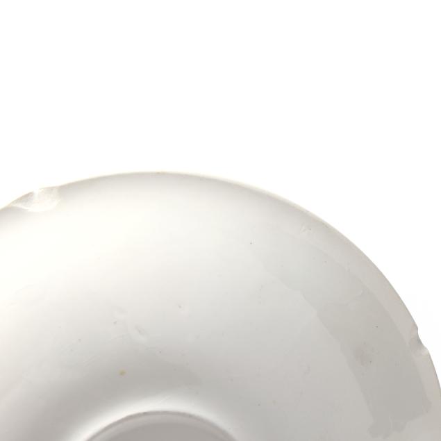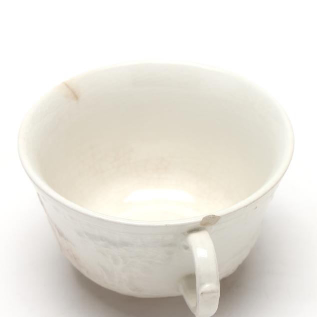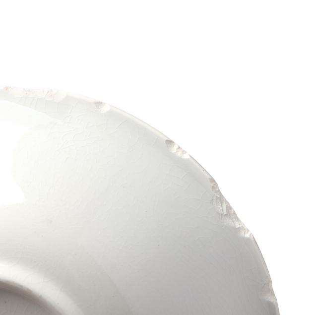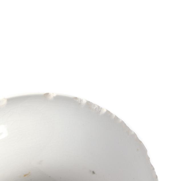 Most with crazing and hairlines; toned hairline to center of one dinner plate; a few coupe bowls with staining from use, (2) with nicks to foot rims, (2) with small chips to rim, and one with several chips surrounding rim; small chips underneath rim of (8) saucers; chip and hairline to rim of one jumbo cup, another with nicks to rim and handle, several with staining from use.