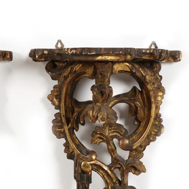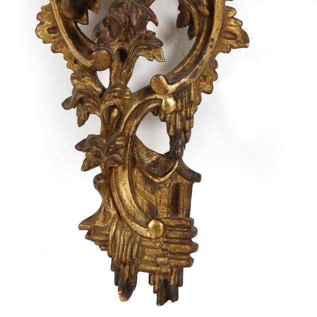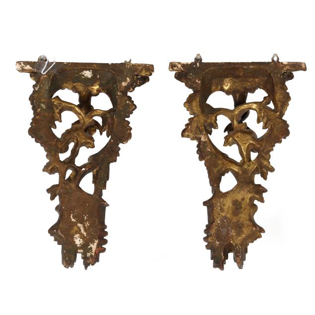 Early 20th century, carved and gilt wood brackets with Chinese style huts towards base and rocaille motifs throughout, unmarked.