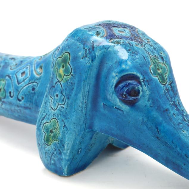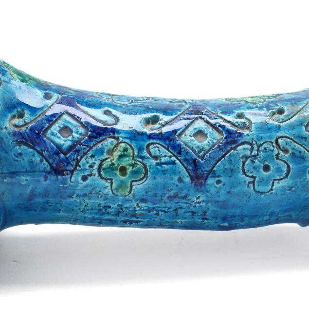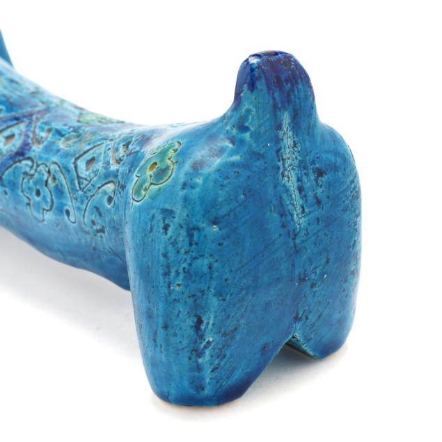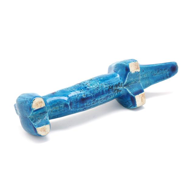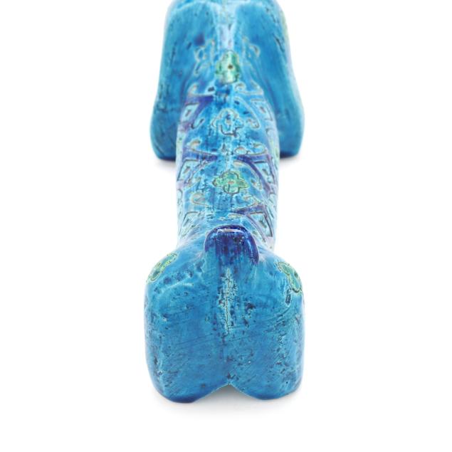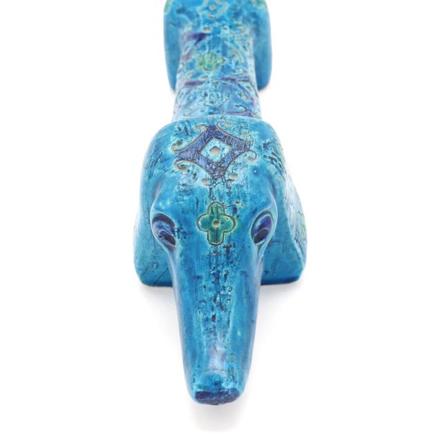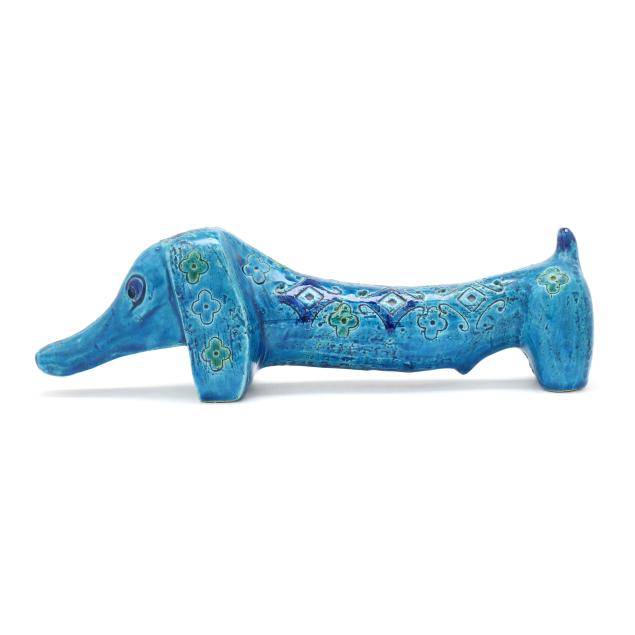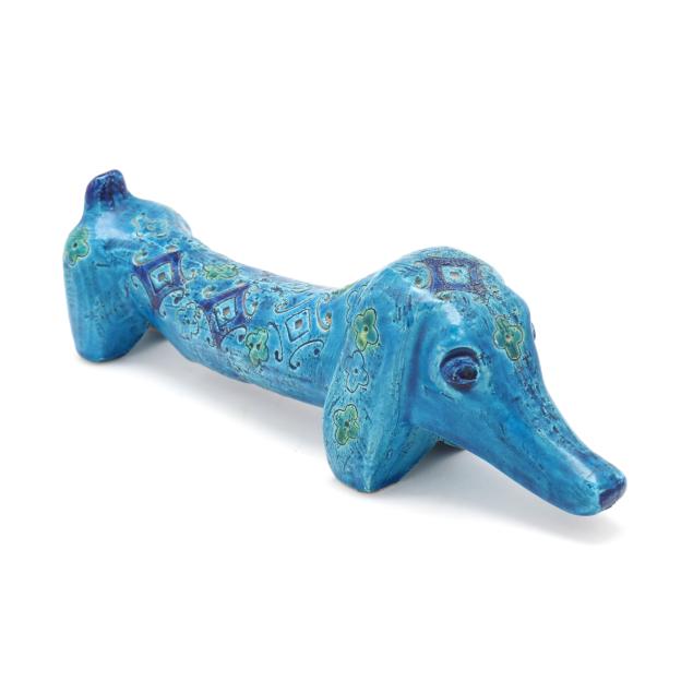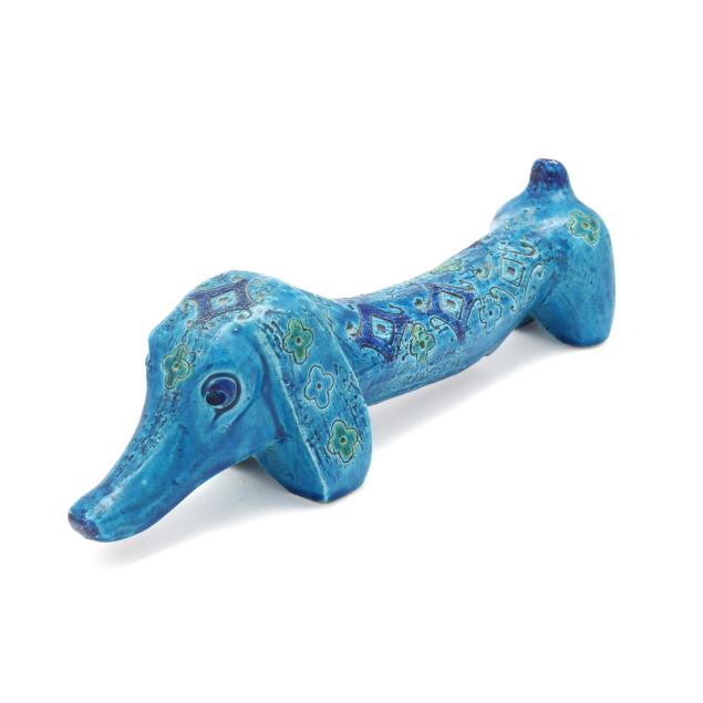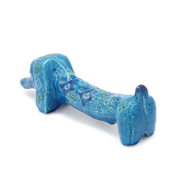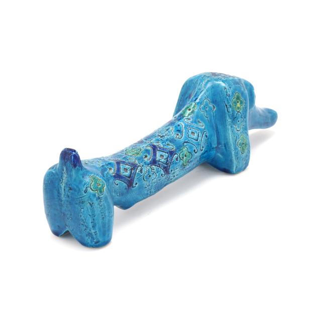 Italy, mid- to late 20th century, pottery Dachshund with incised floral and diamond pattern and vibrant green and blue glaze, marked "MAKE / ITALY" to underside.