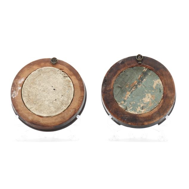 Both frames with losses and gilt rubbing; both medallions with two small holes towards edge and surface scratches; Caesar medallion with separation from frame, adhesive residue visible to medallion.
