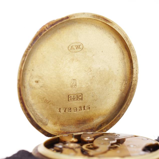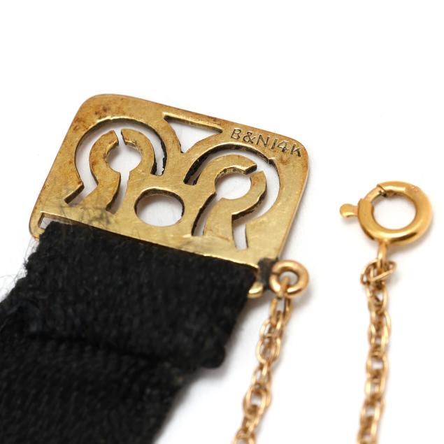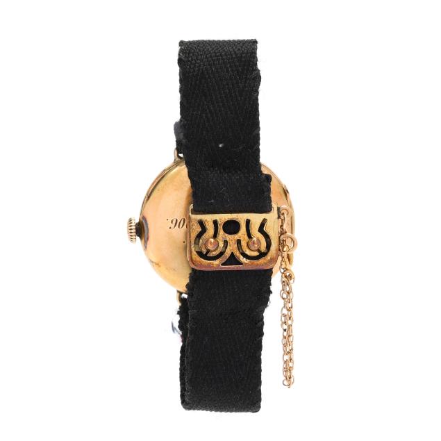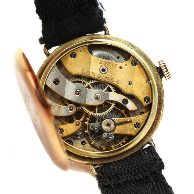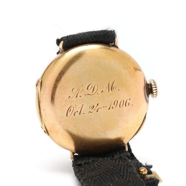 Circa 1906, manual wind, serial number 1729315, the round gold case with polished bezel, the white dial with red and black Arabic numeral hour markers, gold-tone filigree hands, and gold-tone dot minute register, the black fabric strap completed with a gold button clasp and safety chain, stamped B&N 14K, the caseback with presentation engraving "A.D.M. / Oct. 24-1906." and interior numbered and with Swiss hallmarks for 14KT, the movement signed Longines and numbered.