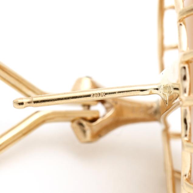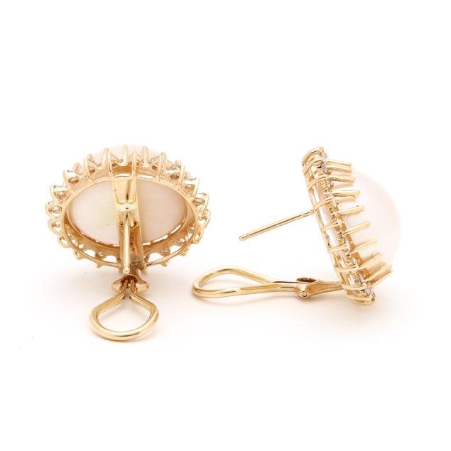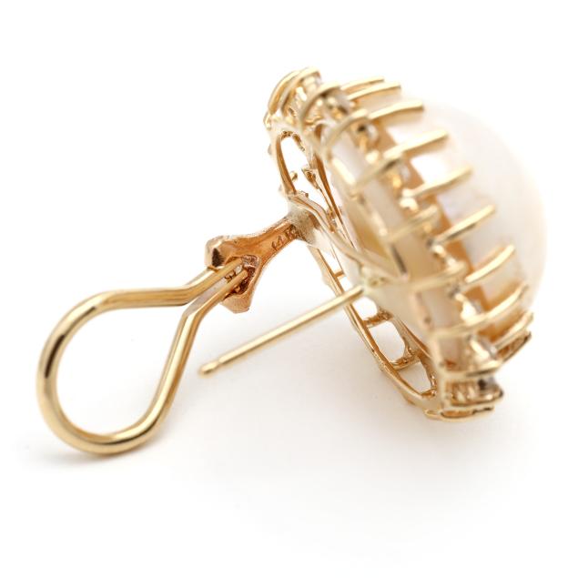 Prong set mabé pearl (16.5mm) set in a halo of full cut round diamond melee, completed with posts and omega clip backs, stamped 14K.