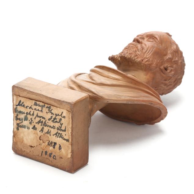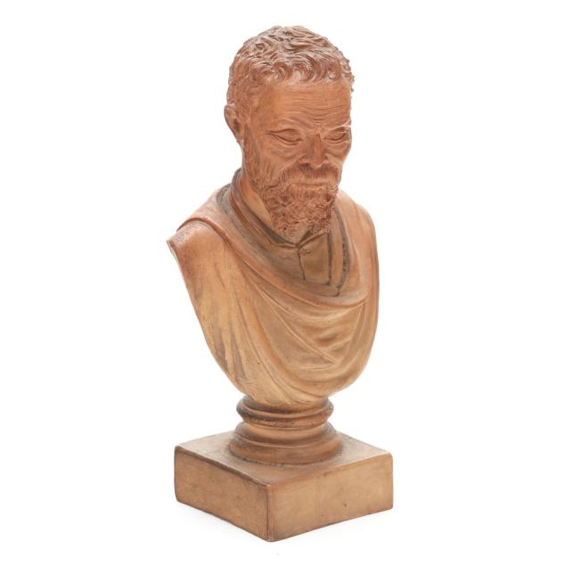 Florence, Italy, second half 19th century, terracotta, signed with artist's signature to posterior, depicting a sculpted bust of Michelangelo Buonarroti (Italian, 1475-1564) after the one made by his follower Daniele da Volterra (Italian, 1509-1566) that rests in the Accademia Gallery in Florence, ink inscribed with provenance label to the underside.