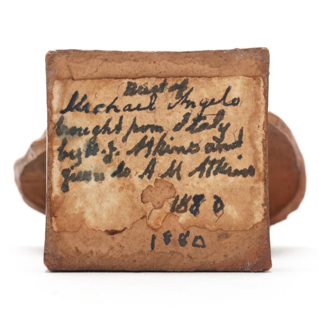 "Bust of / Michael Angelo / brought from Italy / by -.J. Atkins and / given to A.M. Atkins / 1880 / 1880"