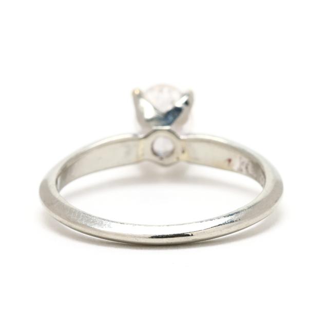 Centered on a prong set oval cut diamond (6.79 x 4.89 x 3.16mm) weighing approximately .77 carat (I color, SI1 clarity), stamped with a maker's mark and 18K.