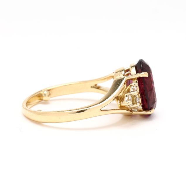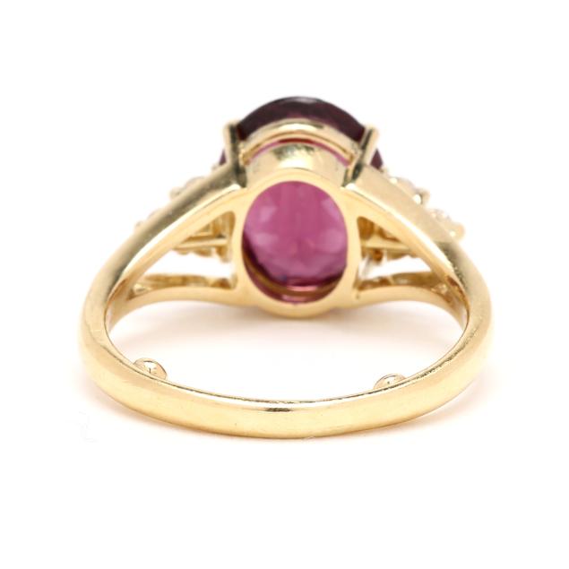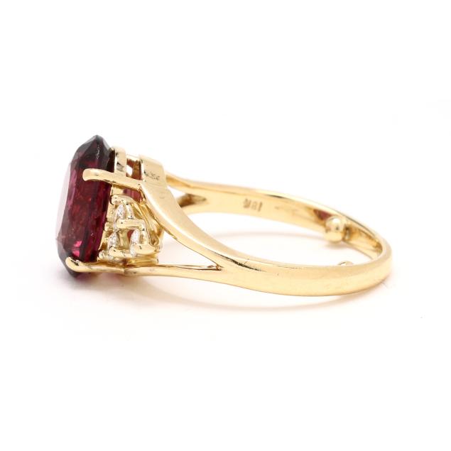 Set to the center with an oval cut rhodolite garnet (11.0 x 8.7 x 5.38mm) weighing approximately 3.80 carats, the shoulders set with full cut round diamond melee, stamped 18K.