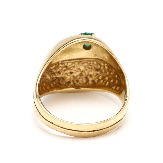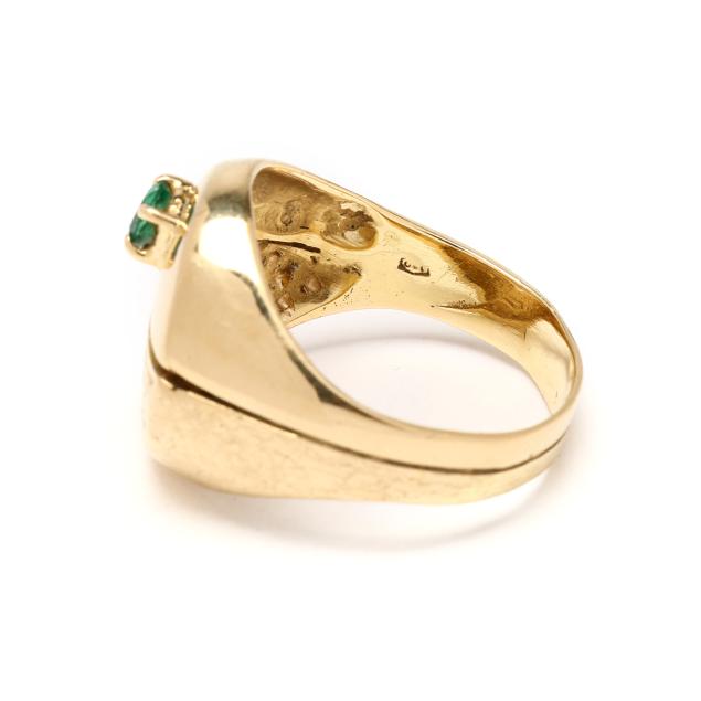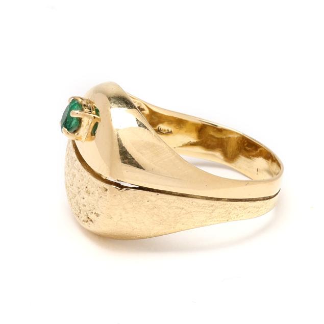 Modernist design ring with central circle with horizontal division with polished and nugget textured finishes, prong set with an oval cut emerald (3.7 x 3mm), on a tapering shank, stamped 750.
