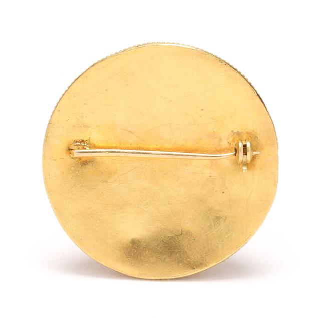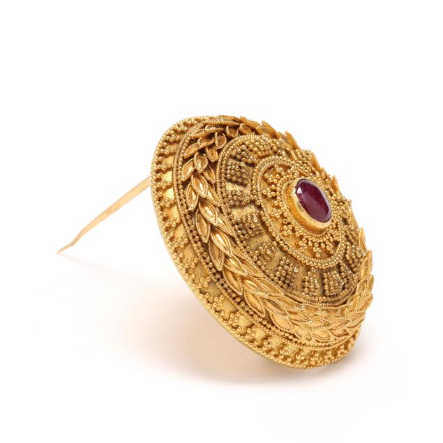 Medallion design brooch set to the center with a round cabochon cut ruby, the whole covered with cannetille and beadwork, completed with a single locking pin stem, XRF testing 19KT.