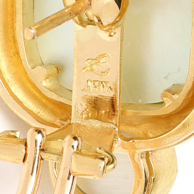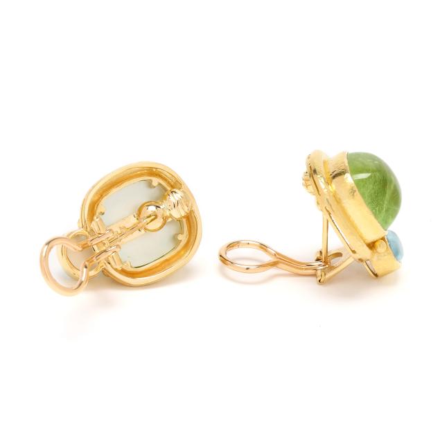 Bezel set cushion cabochon cut peridot (13.3mm) surmount over a bezel set oval cabochon cut aquamarine, each with mother-of-pearl backing, within a hand-hammered gold surround, completed with collapsible posts and omega clip backs, stamped 18K and with maker's mark, XRF testing 18KT.
