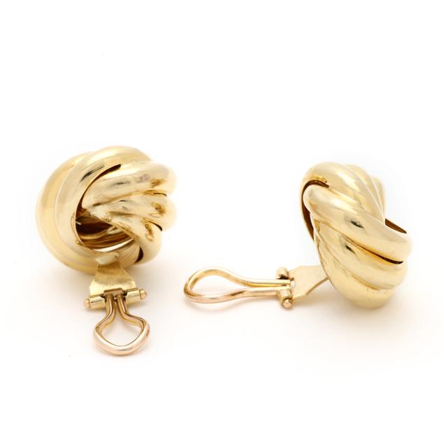 Gold knot design with open center, completed with omega clip backs, testing 14KT.