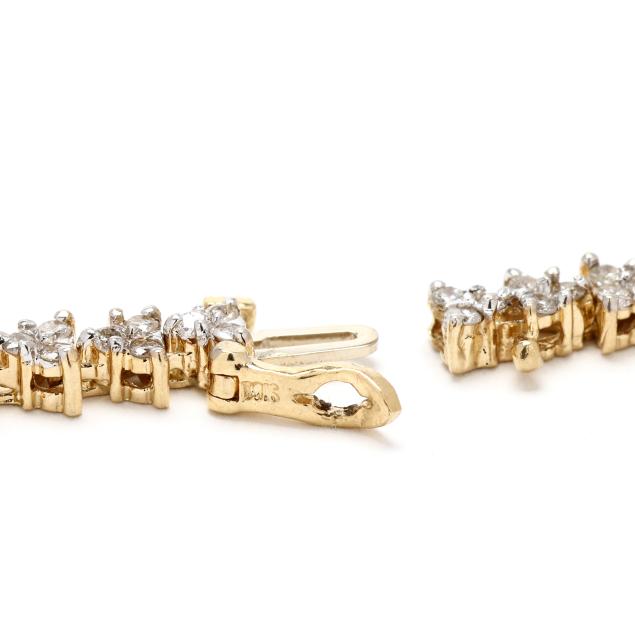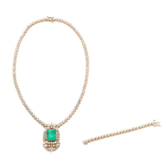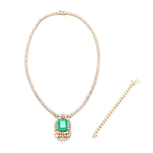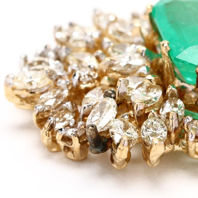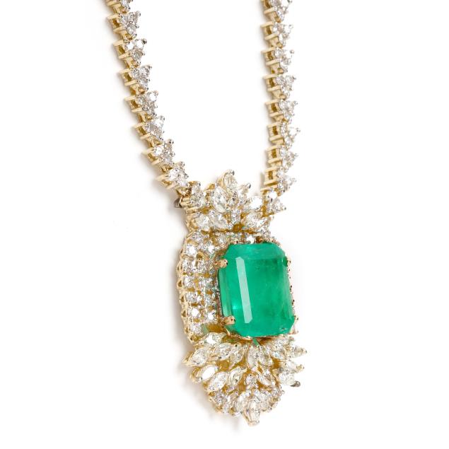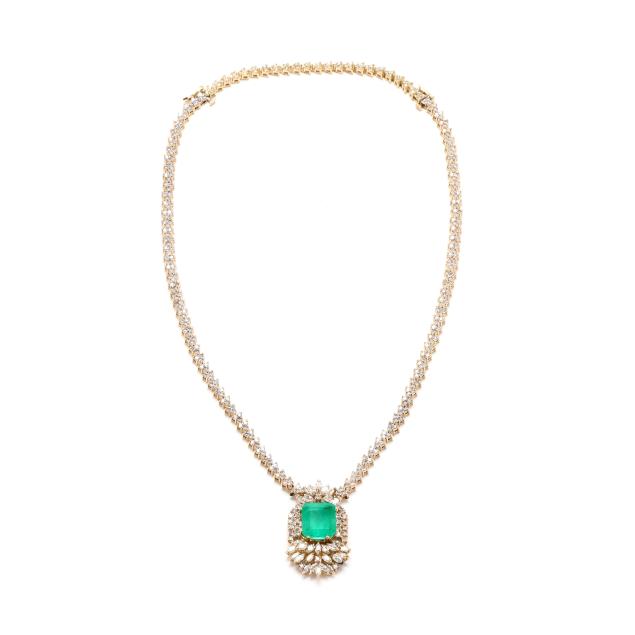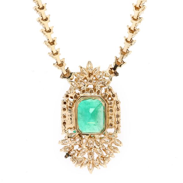 The trefoil link necklace set with full cut round diamonds, suspending a pendant centered on an emerald cut emerald (15.4 x 12.8 x 9.9mm) weighing approximately 14.0 carats, set within a full cut round and marquise cut diamond surround, completed with a box clasp and figure-eight safety, and with a trefoil link extender set with full cut round diamonds, completed with a box clasp and figure-eight safety, stamped 14K. The total diamond weight is approximately 12.90 carats (I-J color, I1-I2 clarity).