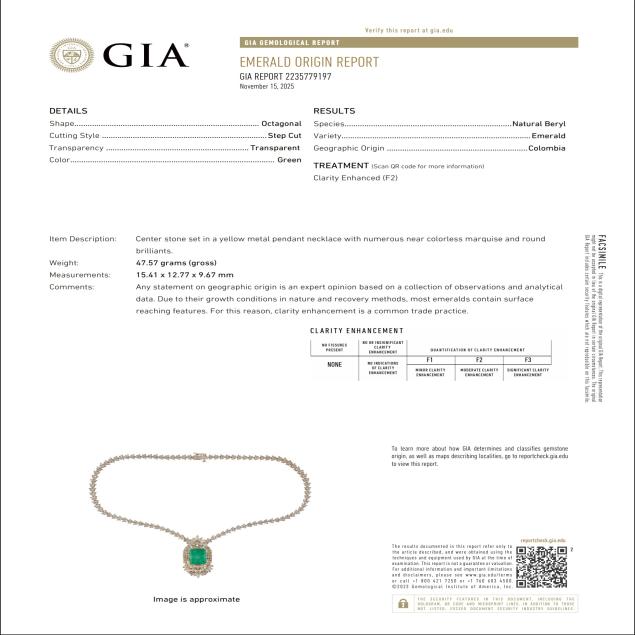 With GIA report stating Natural Beryl / Emerald with moderate clarity enhancement and origin of Colombia.