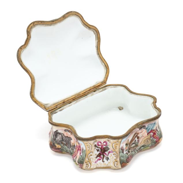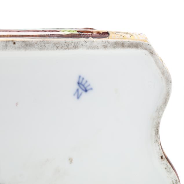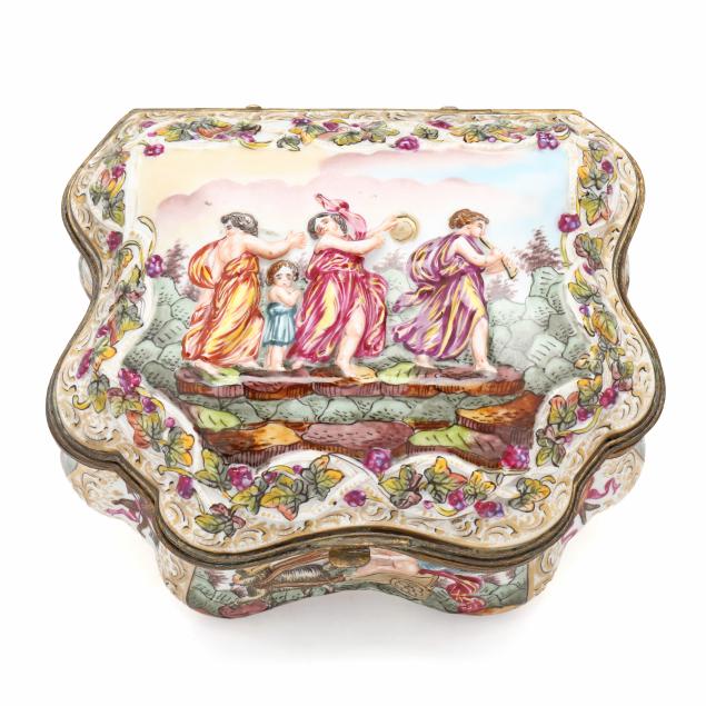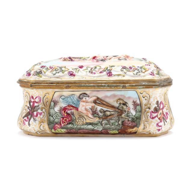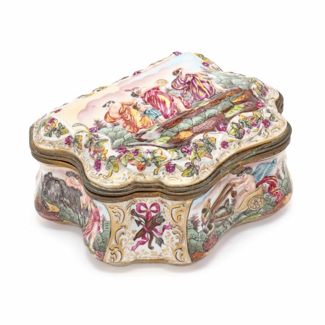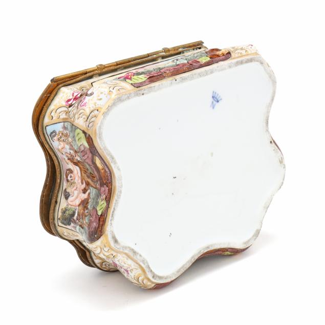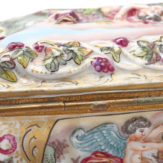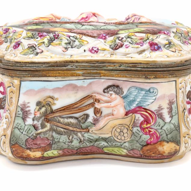 Italy, late 19th century, hand-painted and gilt porcelain hinged box with bas-relief mythical scenes, with cobalt "N" and crown mark to underside.