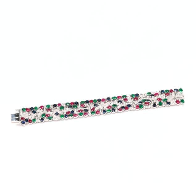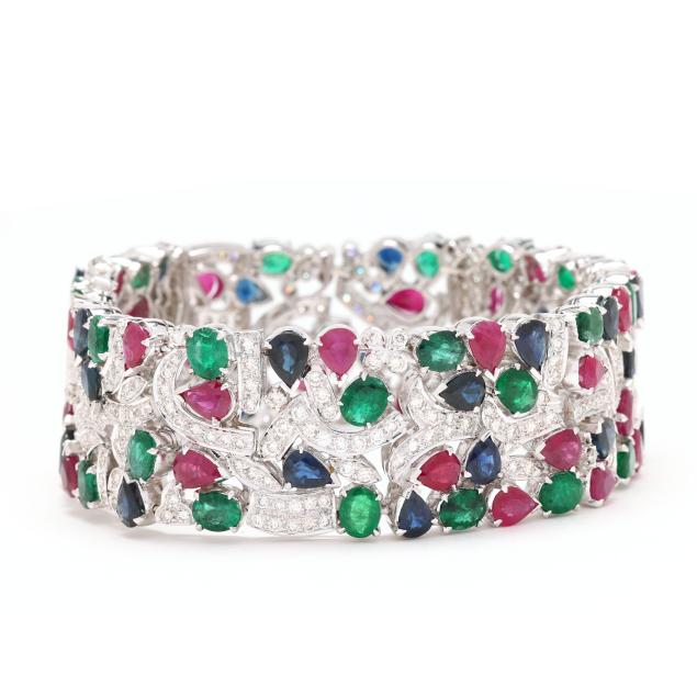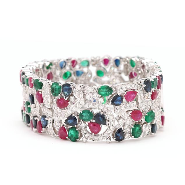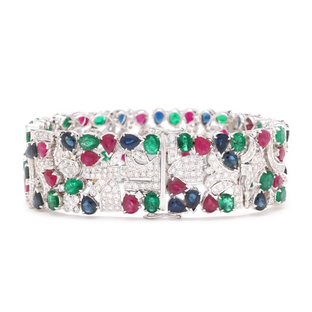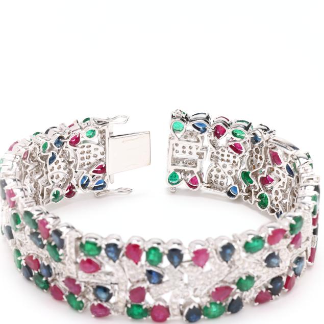 the floral vine motif bracelet set throughout with full cut round diamonds weighing approximately 5.00 total carats (F-G color, VS2-SI1 clarity), and accented with pear cut rubies weighing approximately 11.75 carats, pear cut sapphires weighing approximately 10.00 carats, and oval cut emeralds weighing approximately 9.80 carats, completed with an integrated box clasp with two figure eight safeties, testing 18KT.