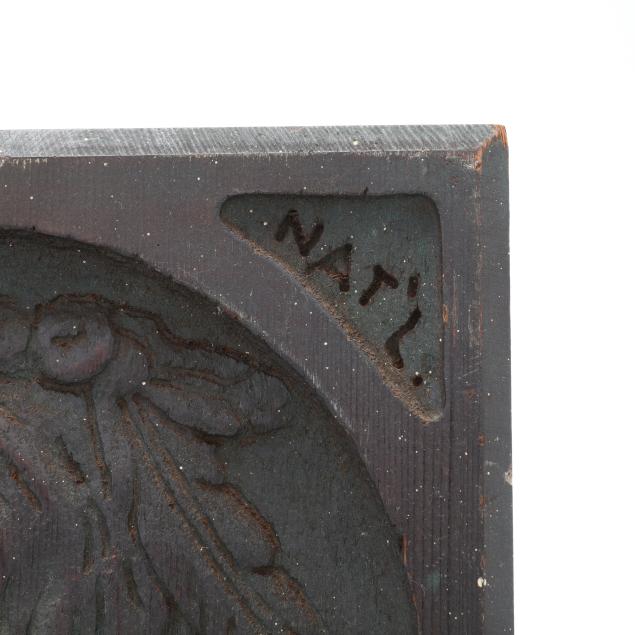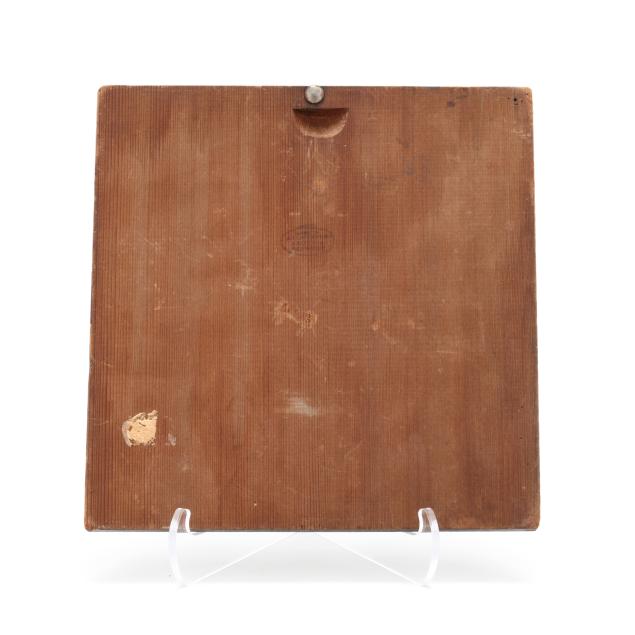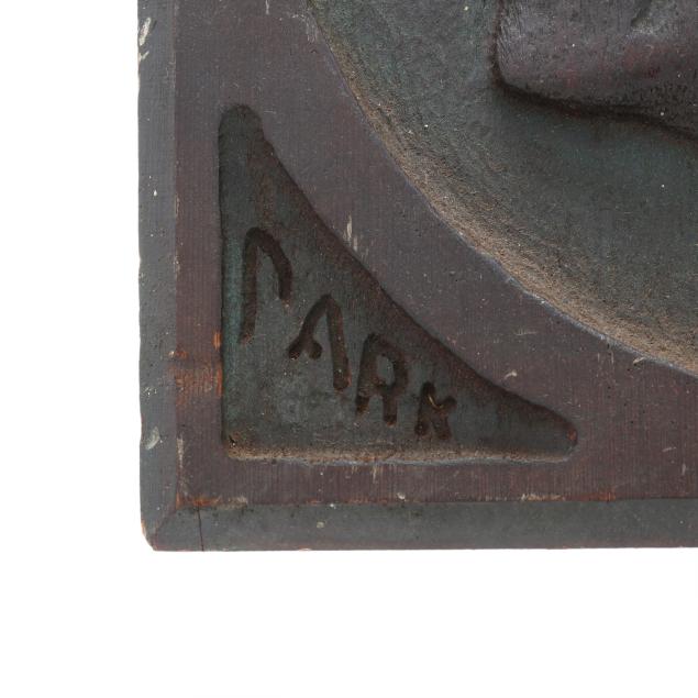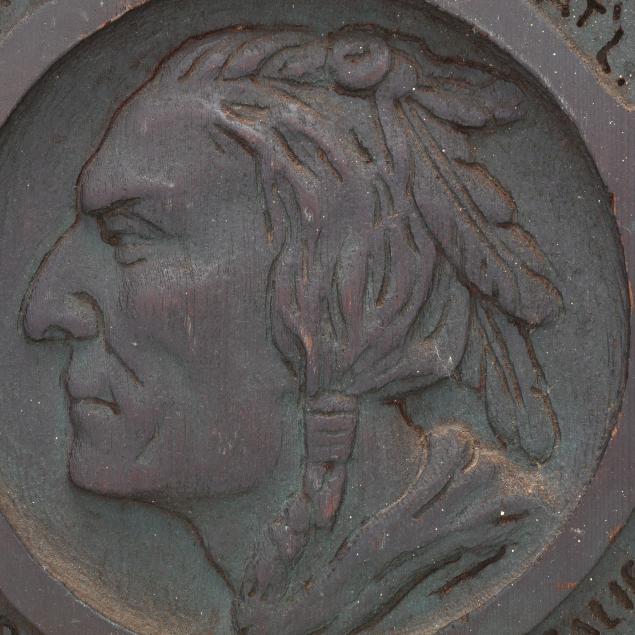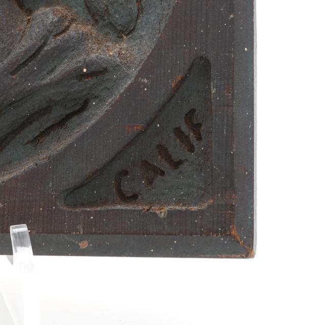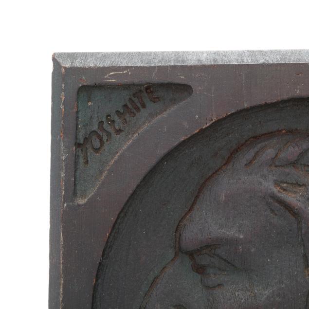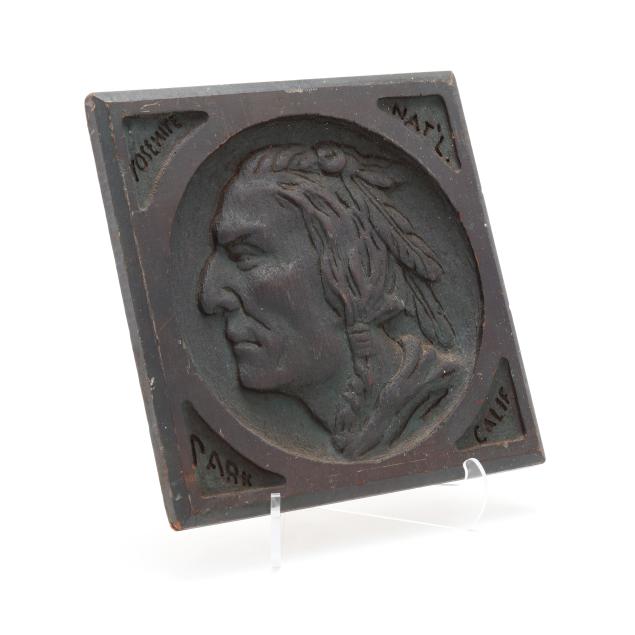 California, third quarter 20th century, redwood plaque with carved bas-relief profile of a Miwok or Ahwahneechee man, each corner carved to read "YOSEMITE / NAT'L / PARK / CALIF," verso with stamp reading "Made in / California / Sequoia / Redwood."