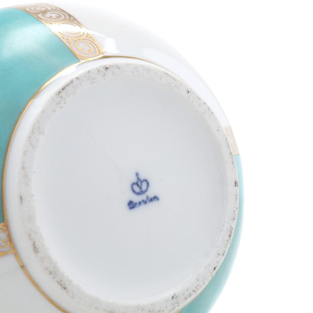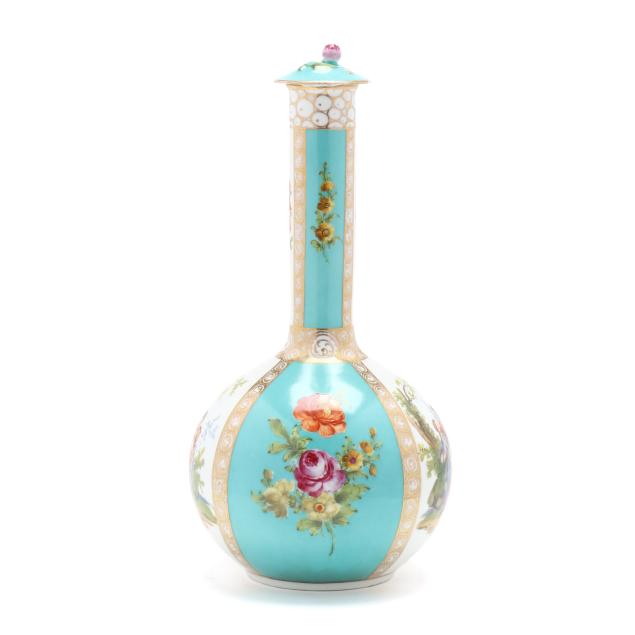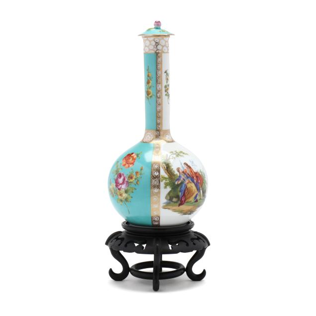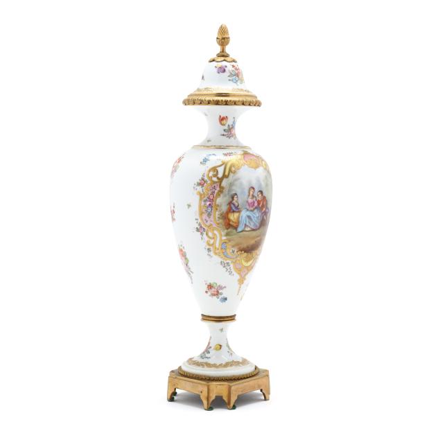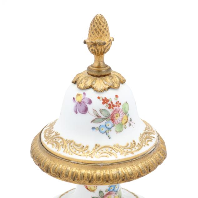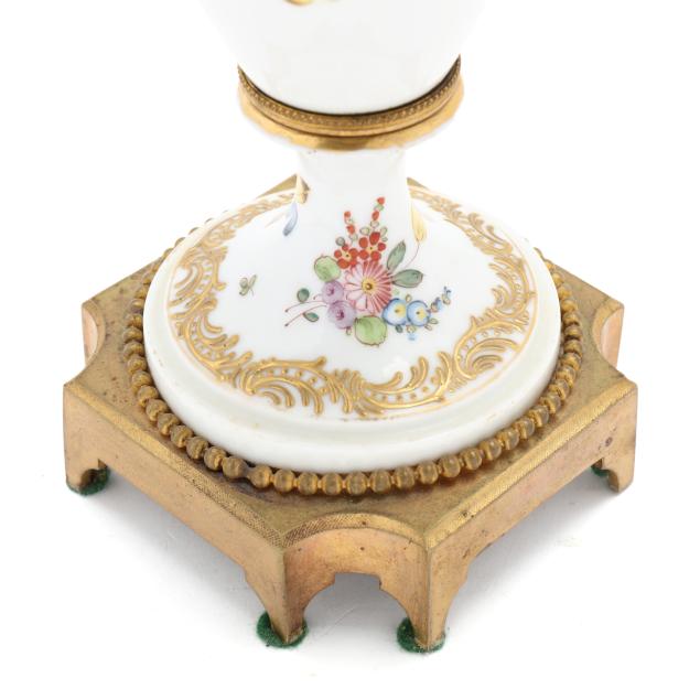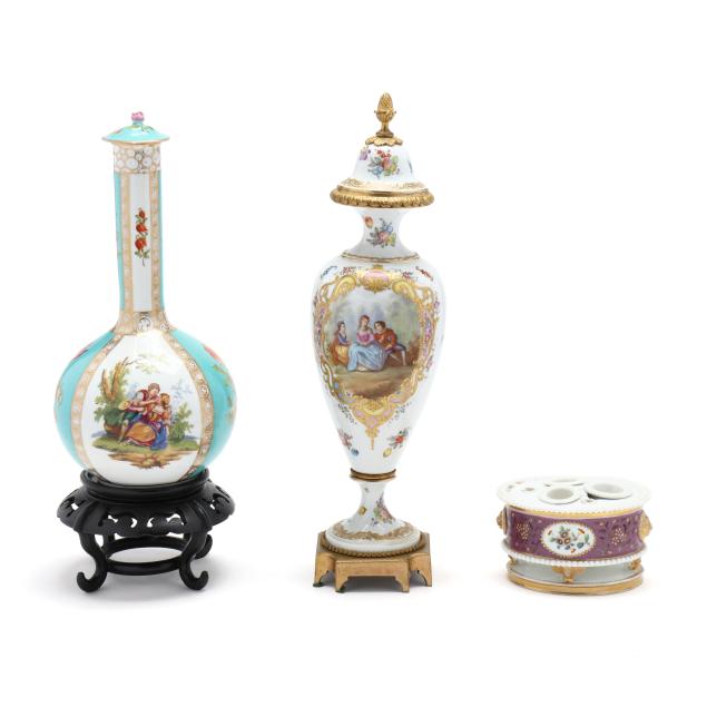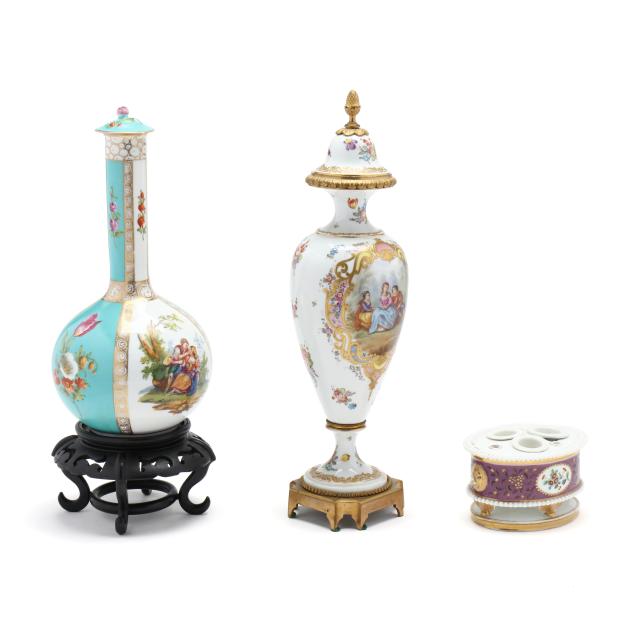(3) hand-painted and gilt porcelain vessels to include: a late 19th to early 20th century bottle form vase with lid, marked with blue crown mark and "Dresden" to underside, includes a carved ebonized wood stand; a likely German 19th century lidded mantle urn with ormolu mounts, blue crown marks to underside; and an early 20th century oval standish on four feet and conforming oval plinth, unmarked.