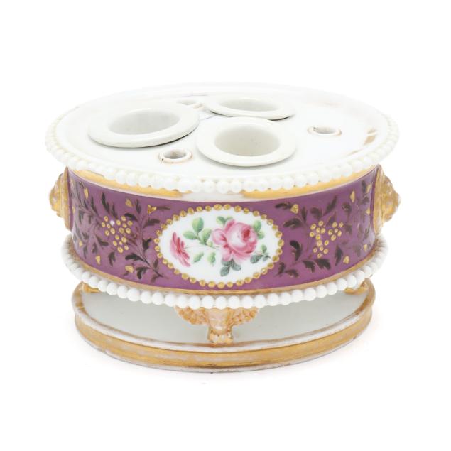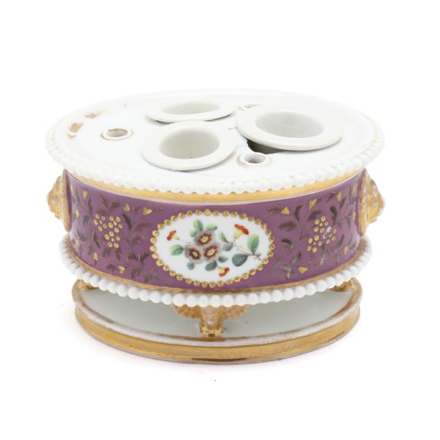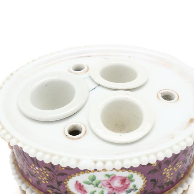 From the Estate of the late Jean and Lawrence Shuping, Raleigh, North Carolina Areas of gilt rubbing to all; hairlines to underside and neck of bottle form vase, small chip and fleabites to lid, lid now secured with putty, fleabites to rose finial; hairlines and losses to top of standish, chip to larger ink well.