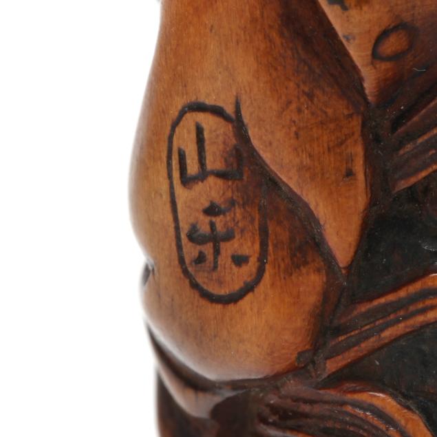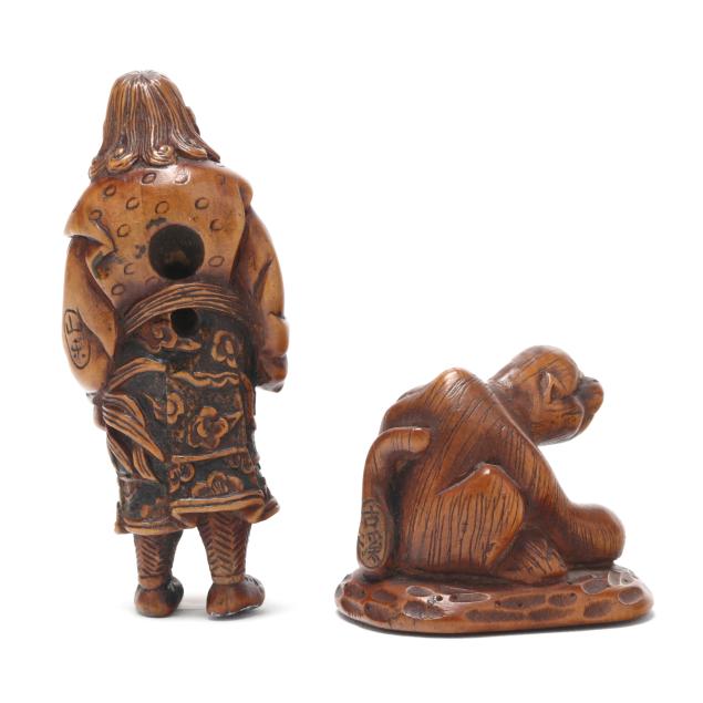 Edo period (1615-1868), includes a carving of a "foreigner" portrayed long and narrow wearing Western style attire, having long hair, and holding a rooster, signed on his sleeve, and a carving of a seated tiger with inset eyes, signed on his tail Kokei.
