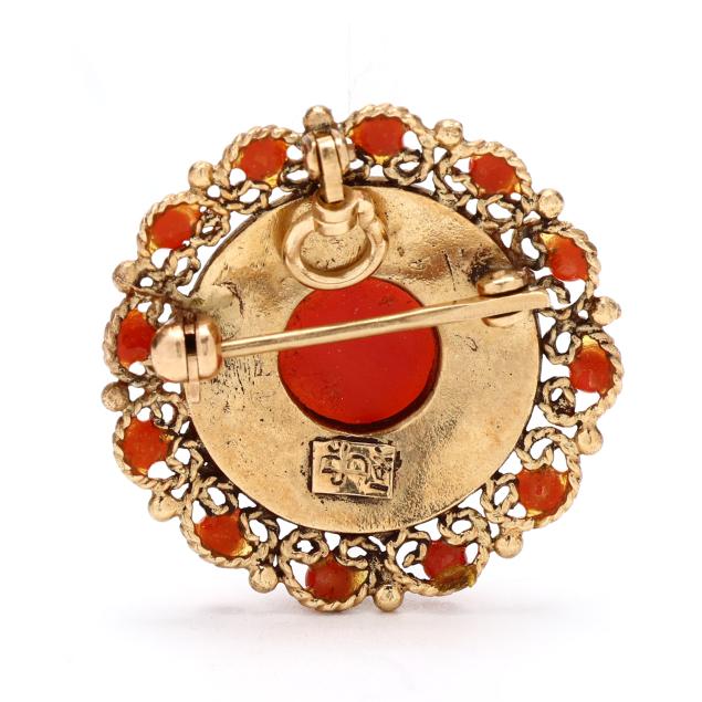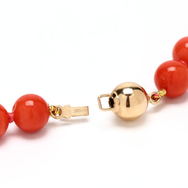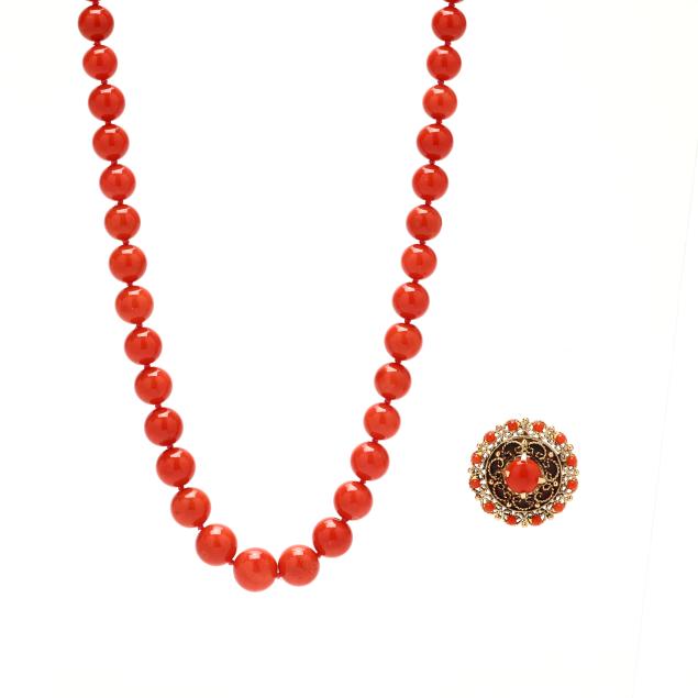 Strung knotted with (61) graduated coral beads (6.7mm to 9.8mm) and completed with a gold ball clasp, stamped 585 (21 in.); with a gold filigree pendant / brooch set with round cabochon cut coral, completed with a hinged bail and a single locking pin stem, stamped 14K and with a maker's mark (15/16 in.).