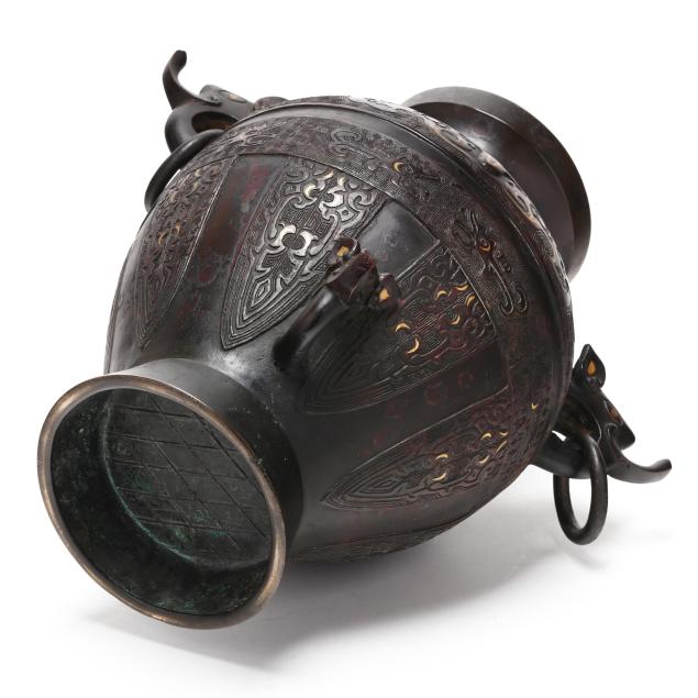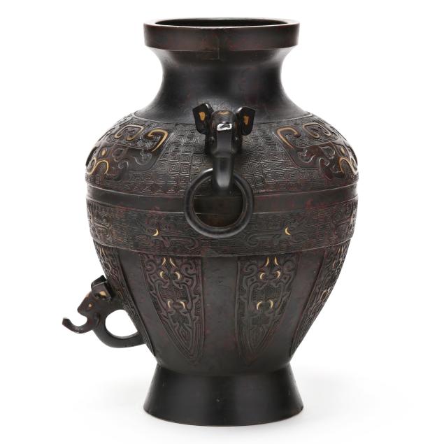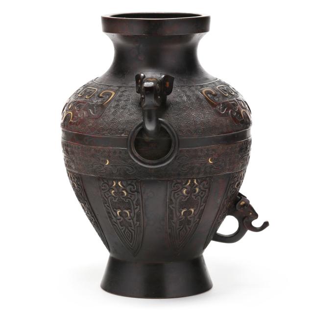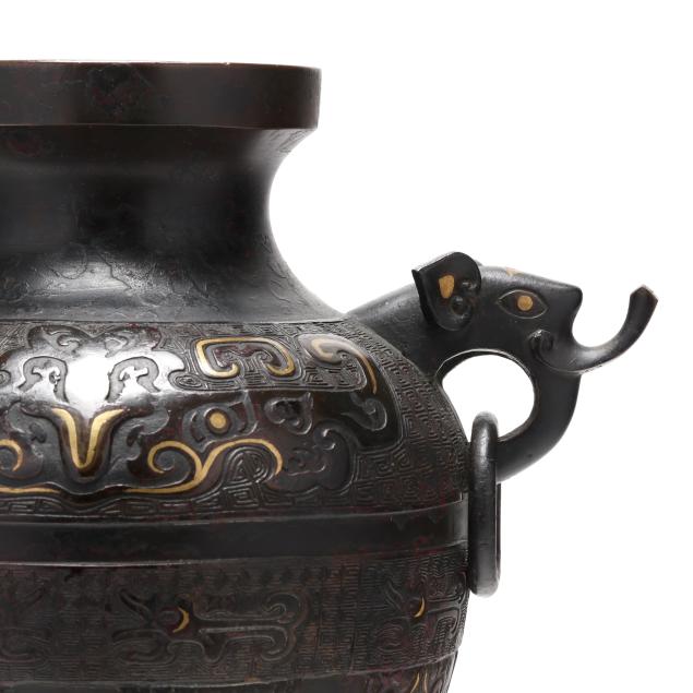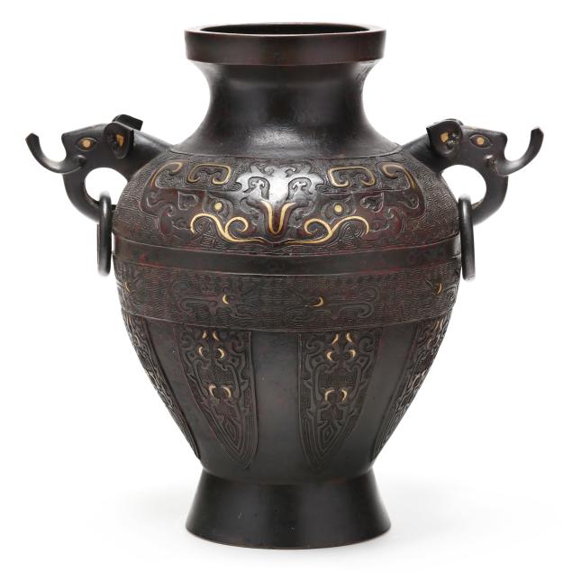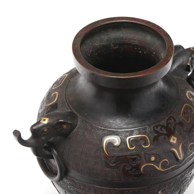 Qing dynasty (1644-1912), 17th or 18th century, bronze inlaid with gold highlights, vase has a thick flat rim, elephant handles with loose rings flank the upper body, another elephant head to lower center of vessel, cicada shaped decoration encircles the lower body under a band with key ground and archaic mythical animals, above a thicker band with