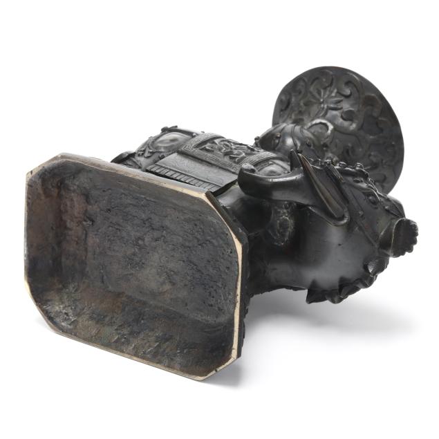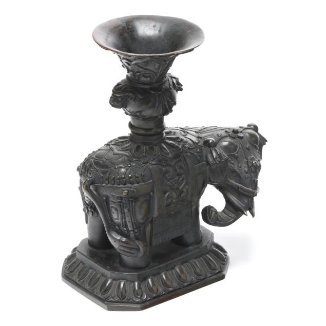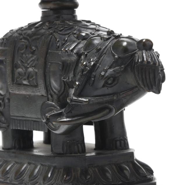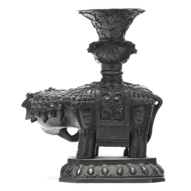 Qing dynasty (1644-1912), 18th century, a bronze elephant with jewel style details, and candle holder urn on its back, on a rectangular lotus petal base.