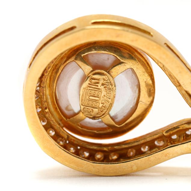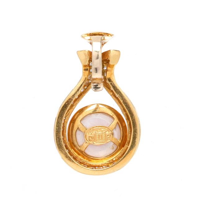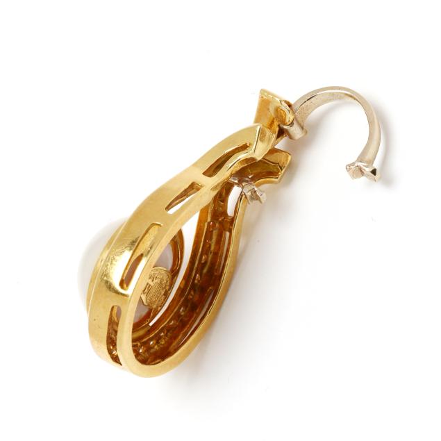The gold pendant channel set with full cut round diamonds weighing approximately .75 total carat (G-H color, SI1-SI2 clarity) cradling a mabé pearl (13mm), completed with a hinged bail, signed and stamped 18KT.