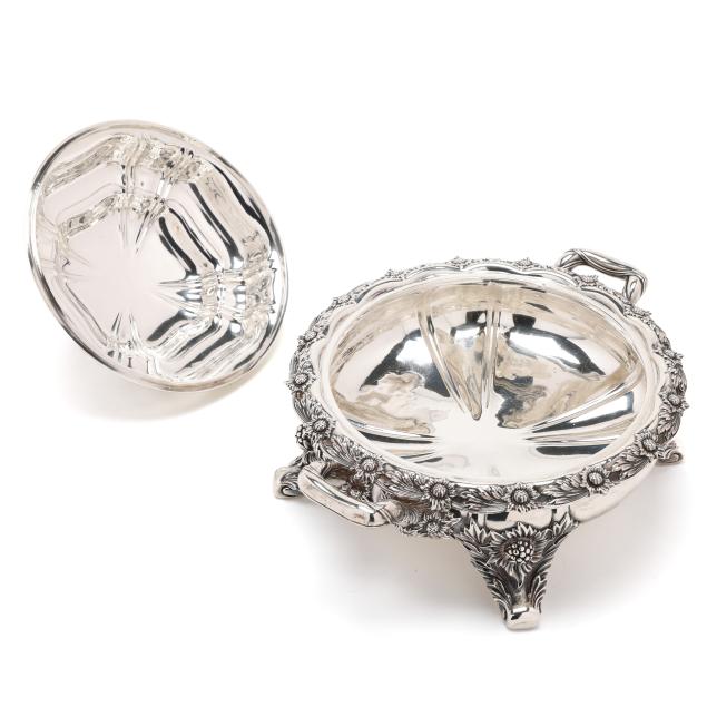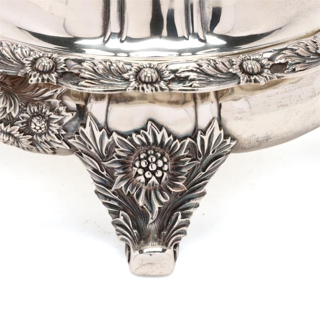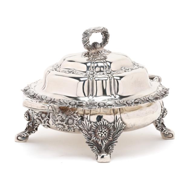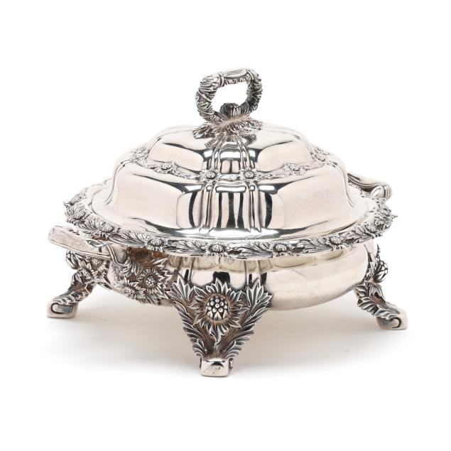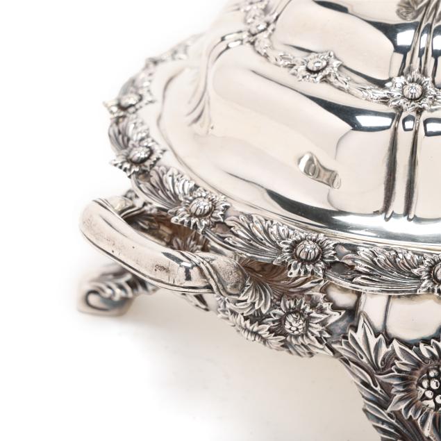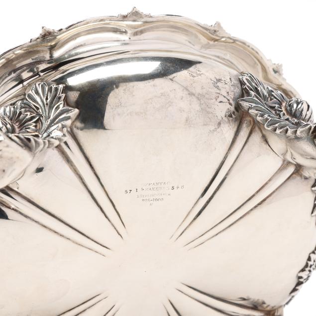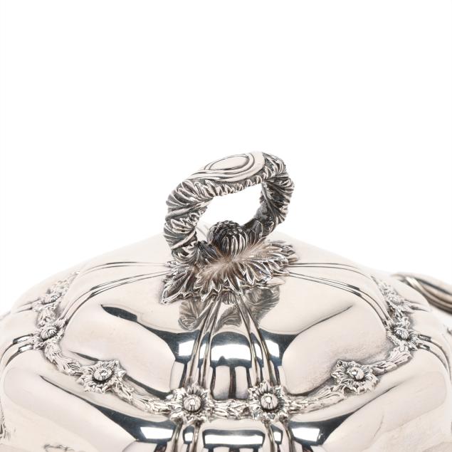 Period mark circa 1873-1891, directorship of Edward Moore, pattern number 5714, featuring hand chased foliate decoration in high relief and a uniform ring top handle, without a monogram.