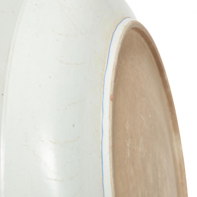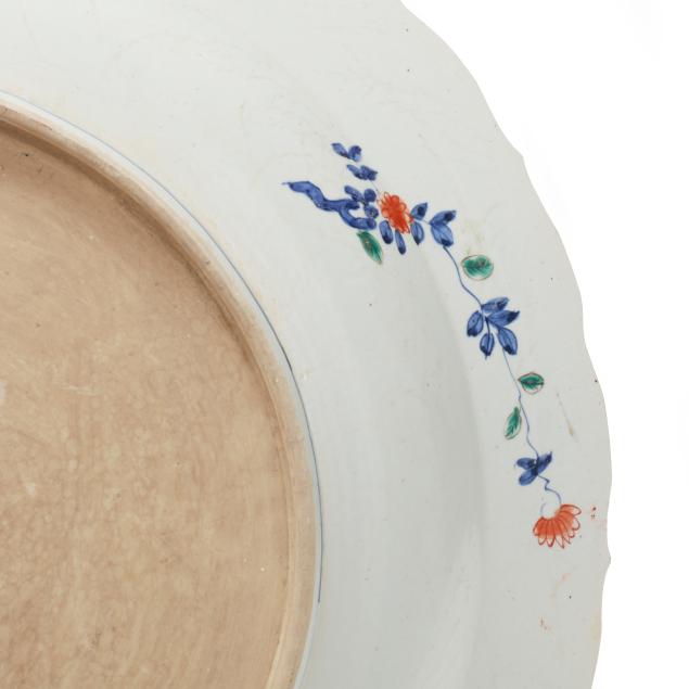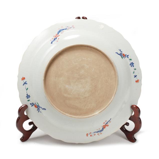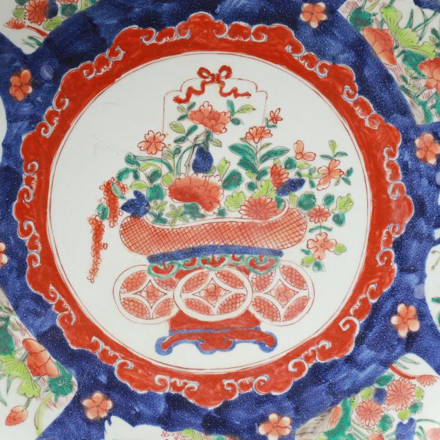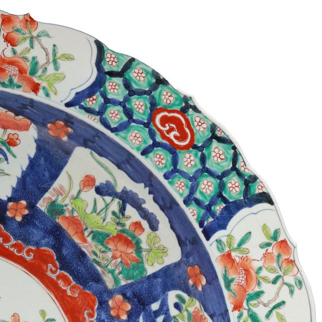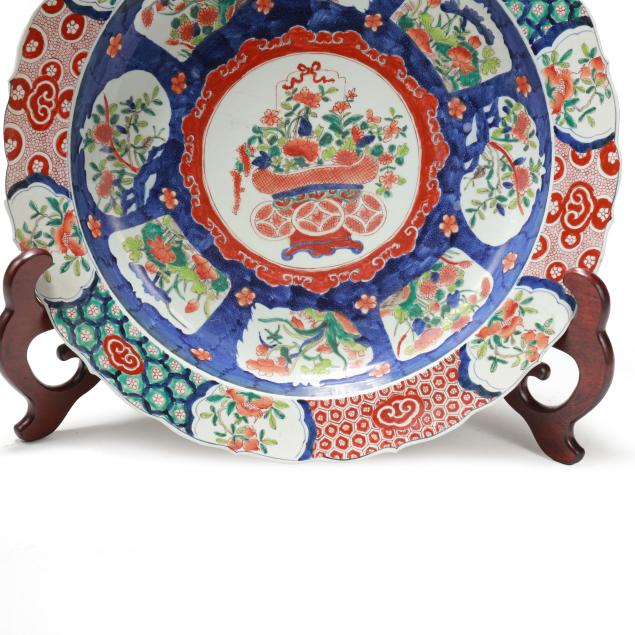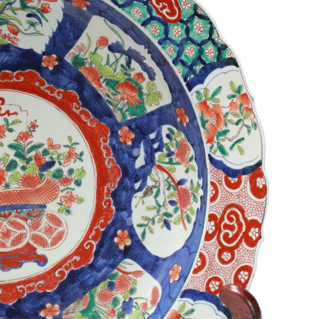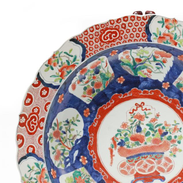 An enormous porcelain charger with barbed rim, hand painted in the Imari palette with two large bands of decoration encircling a central image of a bountiful bouquet of flowers in a coin motif vase with ribbon at top, the outlying bands of decoration include shaped registers containing flora against a vivid blue ground, the outside band of decoration with