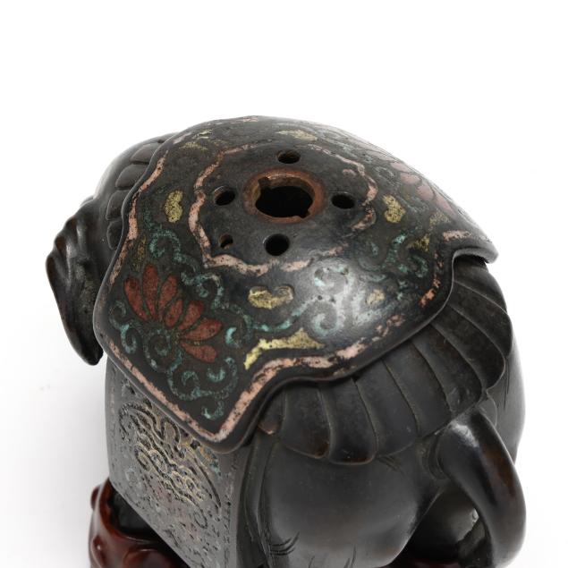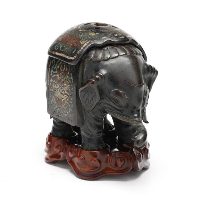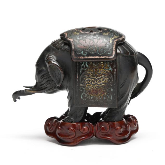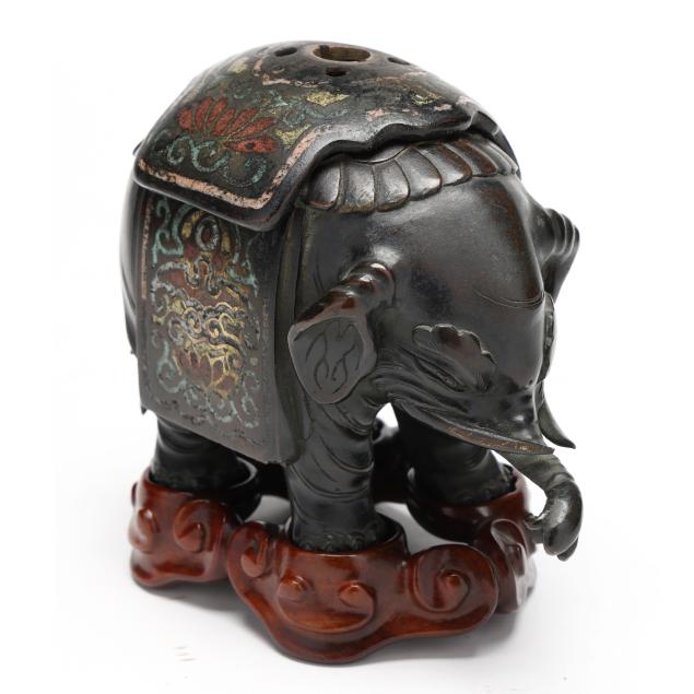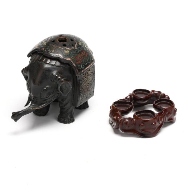 koro) in the form of an elephant, with a reticulated bronze and champleve blanket that can be removed, presented together with a custom fitted carved wood stand.