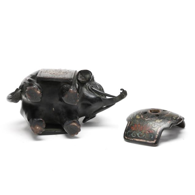 From the Estate of the late Businessman and Conservationist, Russell M. Leiman, Durham, North Carolina Appears to be missing top element; rubbing and wear to surface with some loss to champleve on saddle and blankets; some spots of loss to the bronze on back of elephant.