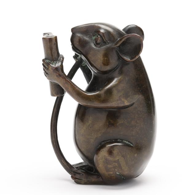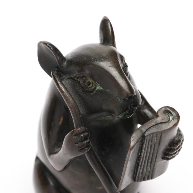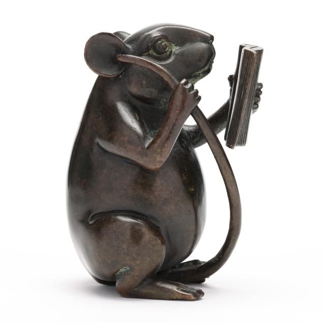 Early to mid-20th century, a large rat or mouse is cast sitting holding his tail in one hand and a book in the other which he is studying with great interest, unmarked.