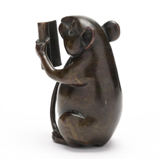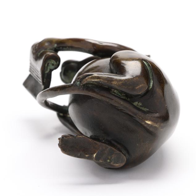 Slight rubbing to patina; areas of verdigris to whole, mainly to crevices.