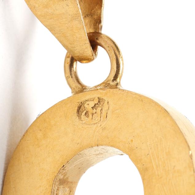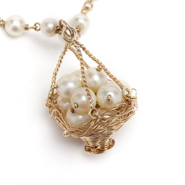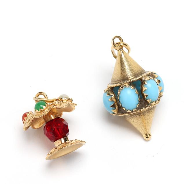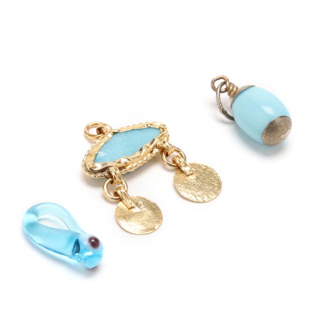 To include: a charm in the shape of a spindle, set to the middle with oval cabochon cut blue glass, completed with a bail, stamped 750 and with a partial Italian registry mark (1.75 in.); a charm in the shape of lamp, with a faceted red glass bead set to the body, and round cabochon cut glass set to the top, completed with a jump ring bail, stamped 750 and with partial stamp (1 in.); a gold wire basket charm set with cultured pearls (6-7mm) in the basket (1.5 in.), suspended from a gold and pearl station bracelet, set with cultured pearls (5-6mm), completed with a jump ring clasp, charm and clasp stamped 14K (7.5 in.); and a group of charms suspended from a safety pin, including a horseshoe set with round cabochon cut turquoise, completed with a bail, and with Arabic markings for 18KT (1.5 in.); an oval charm set with textured blue glass, suspending two gold discs, testing 18KT; a blue glass creature (.5 in.); and an oval shaped blue glass charm.