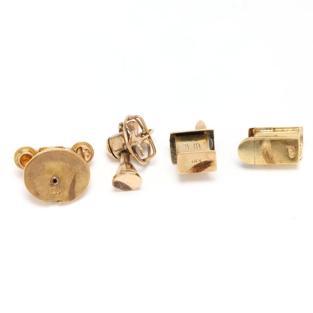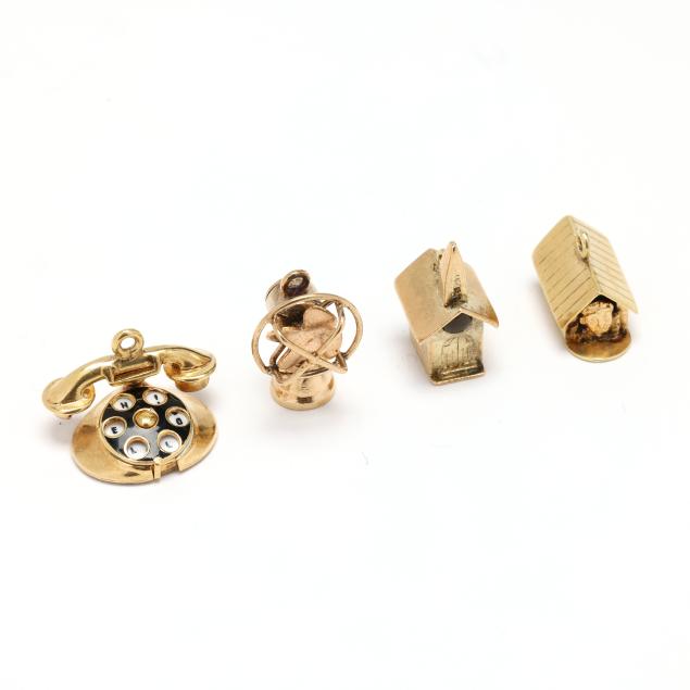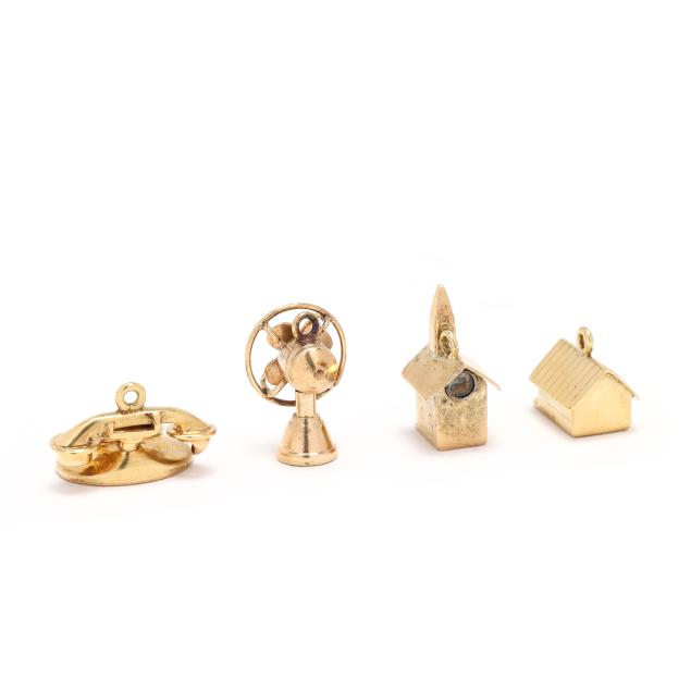 To include: a gold Stanhope church charm, stamped 14K (.5 in.), a gold desk fan charm, stamped 14K; a gold and enamel rotary telephone charm, spelling out "HELLO!" and "I LOVE U", stamped 14 and with a maker's mark; and a gold man in the dog house charm, stamped 14K and with a maker's mark (3/8 in.).