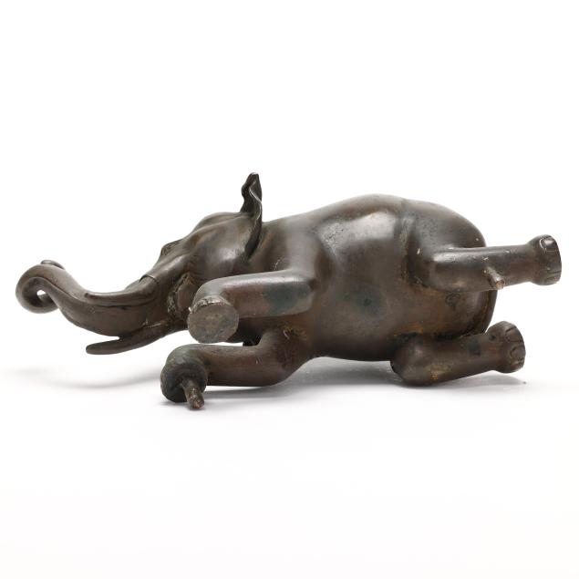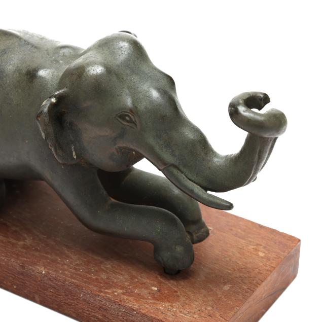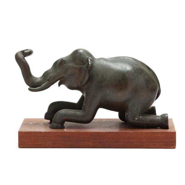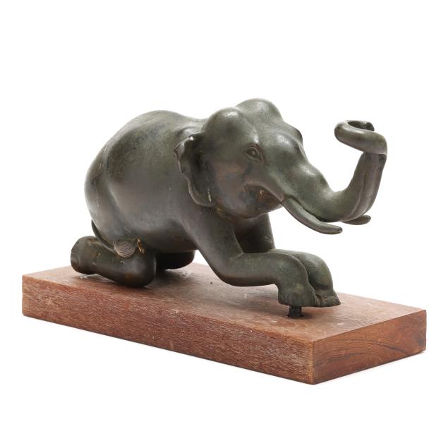 Early to mid-20th century, a bronze elephant cast kneeling with his trunk lifted up in the air, presented on a wood stand.